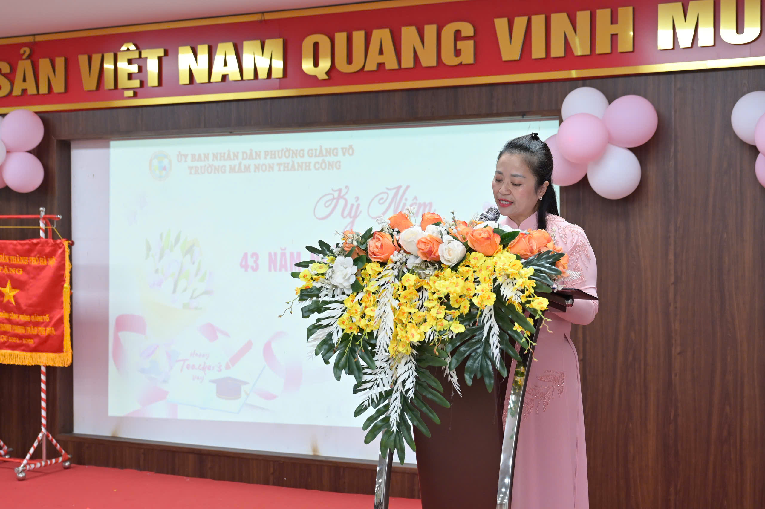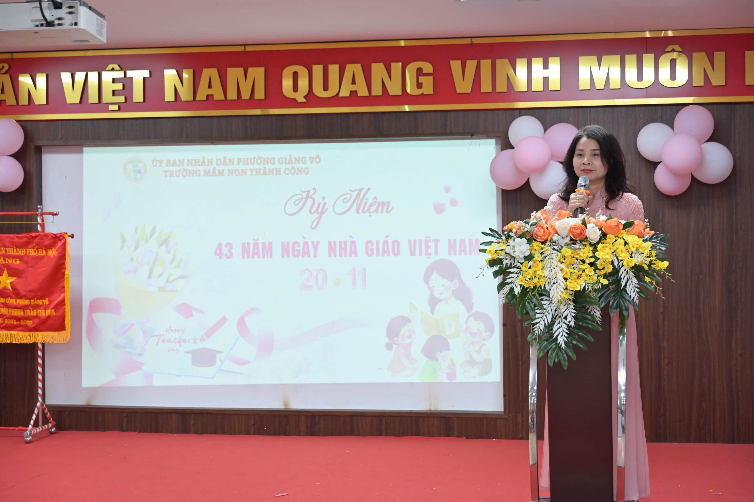Lễ kỷ niệm 43 năm Ngày Nhà giáo Việt Nam là dịp đặc biệt để Trường Mầm non Thành Công nhìn lại hành trình đã qua, tiếp thêm động lực cho đội ngũ sư phạm vững vàng tiến bước. Với tinh thần đoàn kết, trách nhiệm và tình yêu thương trẻ thơ, nhà trường sẽ tiếp tục nỗ lực xây dựng môi trường giáo dục hạnh phúc, an toàn và chất lượng cho các con.