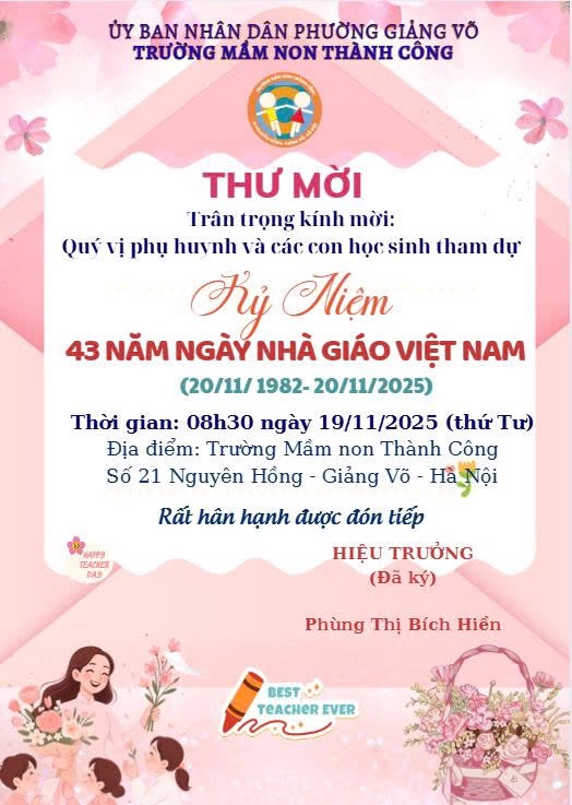 Buổi lễ là dịp tri ân những đóng góp thầm lặng nhưng vô cùng ý nghĩa của các thầy cô giáo, đồng thời tạo không khí vui tươi, gắn kết giữa nhà trường – gia đình – học sinh. Nhà trường rất hân hạnh được đón tiếp quý phụ huynh và các con đến tham dự và chung vui.