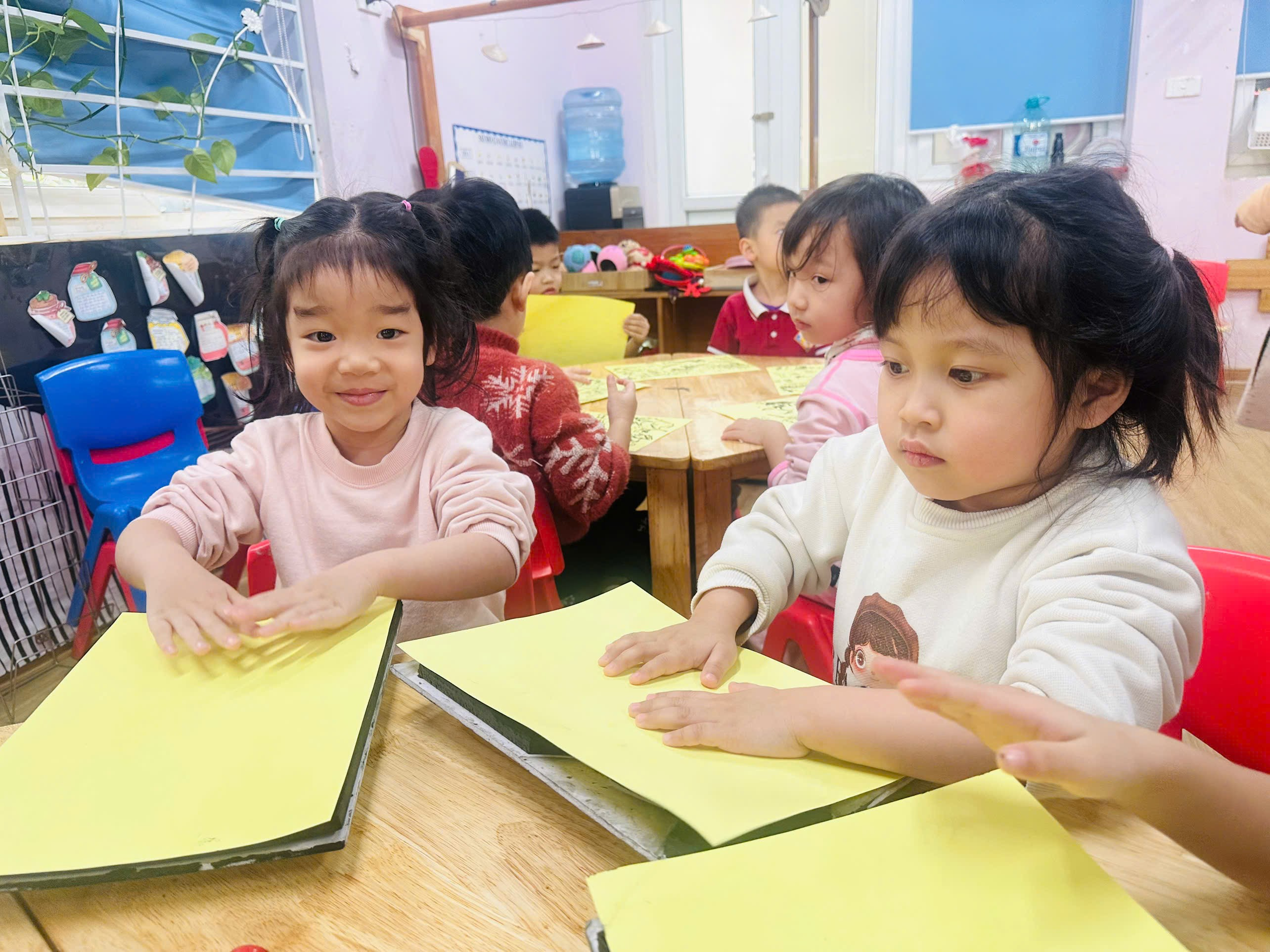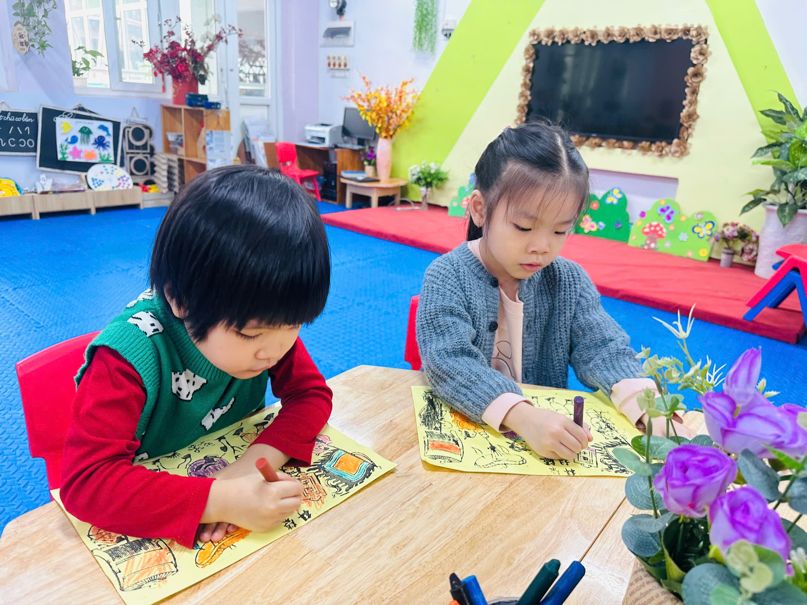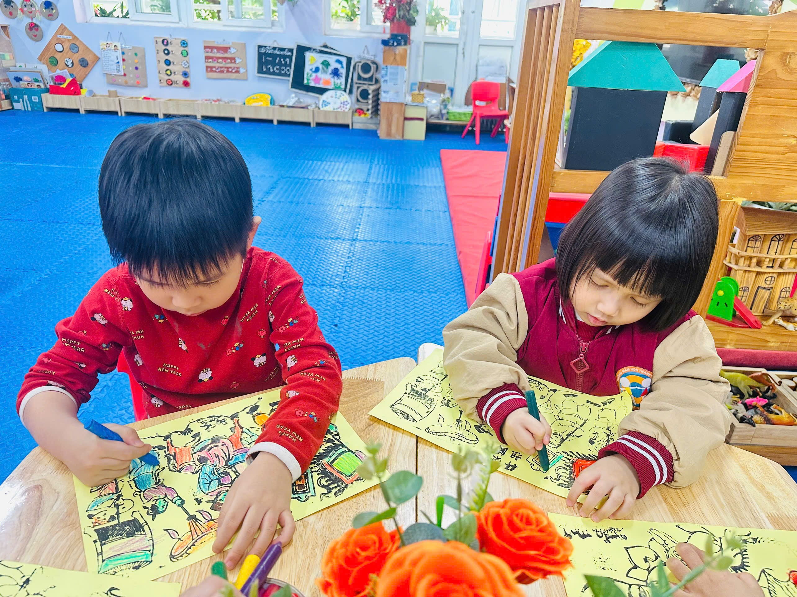Trong quá trình tham gia hoạt động, trẻ vô cùng hứng thú và say mê. Các con được quan sát, in tranh, tô màu và sáng tạo theo cách riêng của mình. Mỗi sản phẩm không chỉ là một bức tranh mà còn là sự thể hiện sự khéo léo, tập trung và niềm yêu thích của trẻ đối với văn hóa dân tộc.