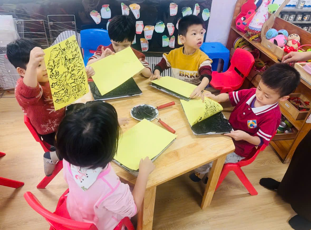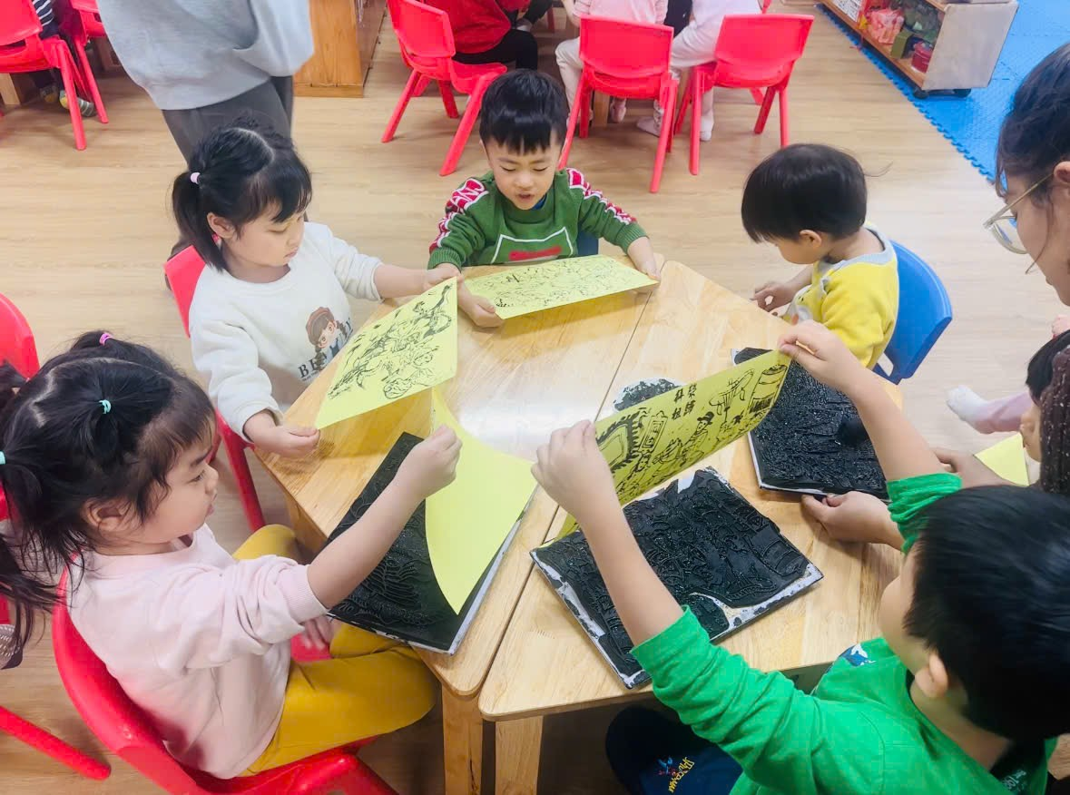 Dưới đây là một số hình ảnh sinh động, đáng yêu của các con trong hoạt động trải nghiệm làm tranh dân gian Đông Hồ:
