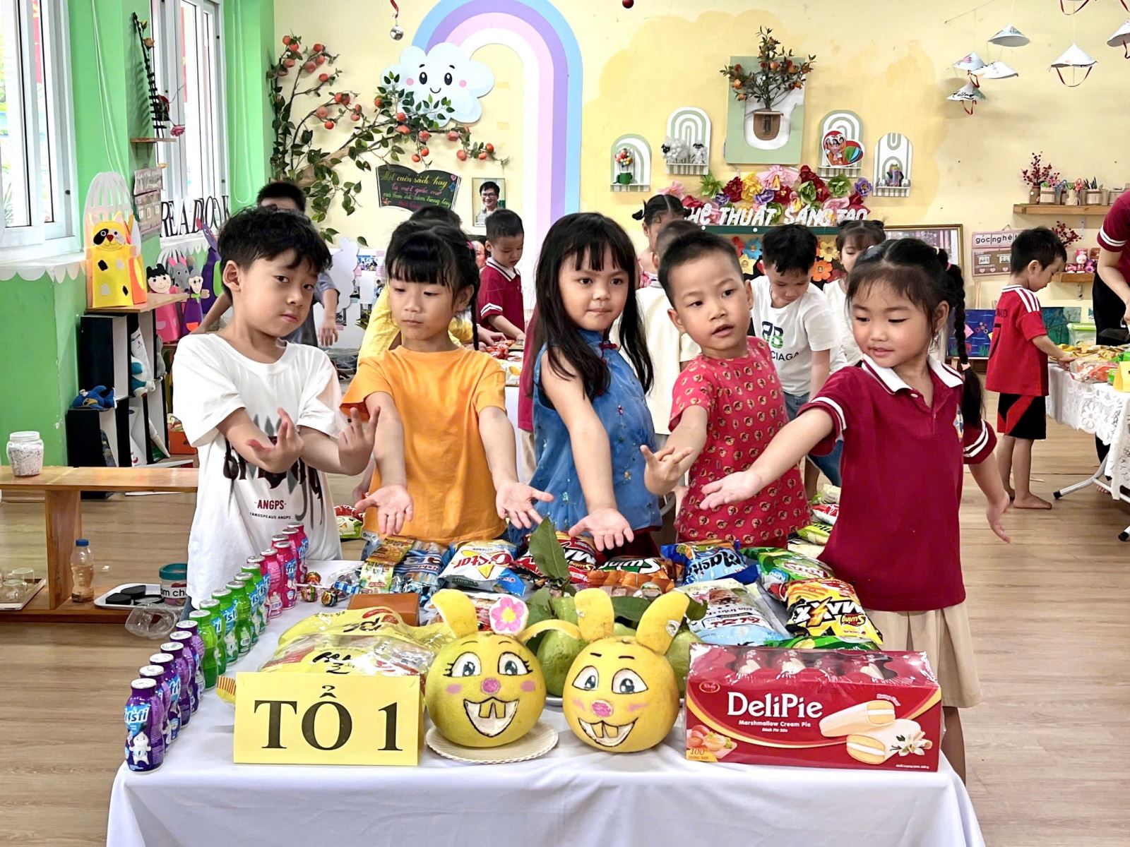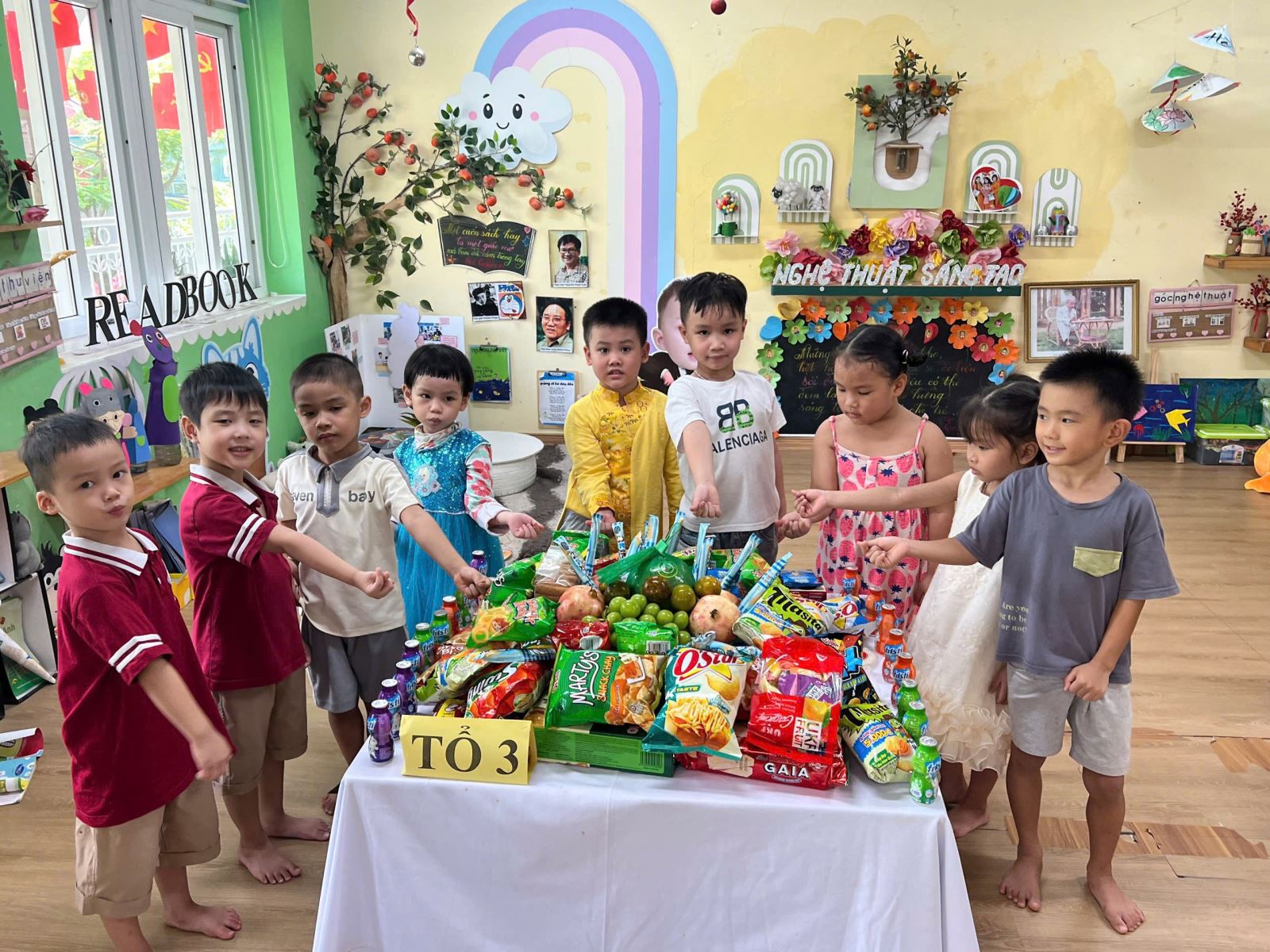 Các con cùng nhau thi bày mâm cỗ Trung Thu giữa các tổ. Mỗi mâm cỗ đều mang nét đẹp riêng, đầy ắp sự sáng tạo, khéo léo và niềm háo hức trẻ thơ. 🍎🍐🍇🍰