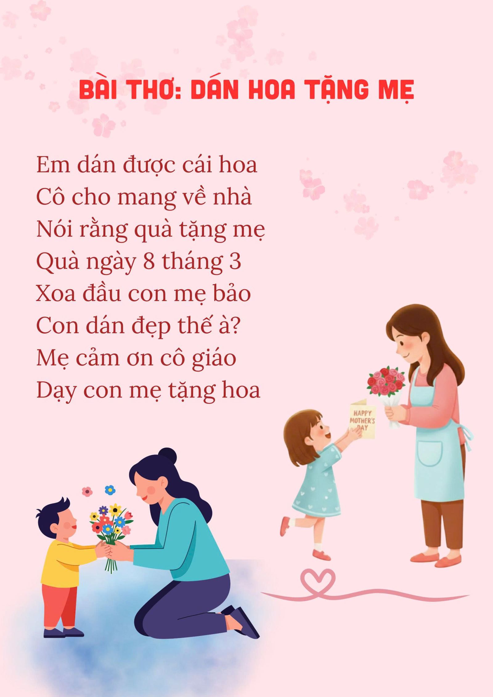 Bài thơ kể về hình ảnh em bé tự tay dán những bông hoa xinh xắn để tặng mẹ. Dù món quà rất đơn giản, nhưng lại chứa đựng: