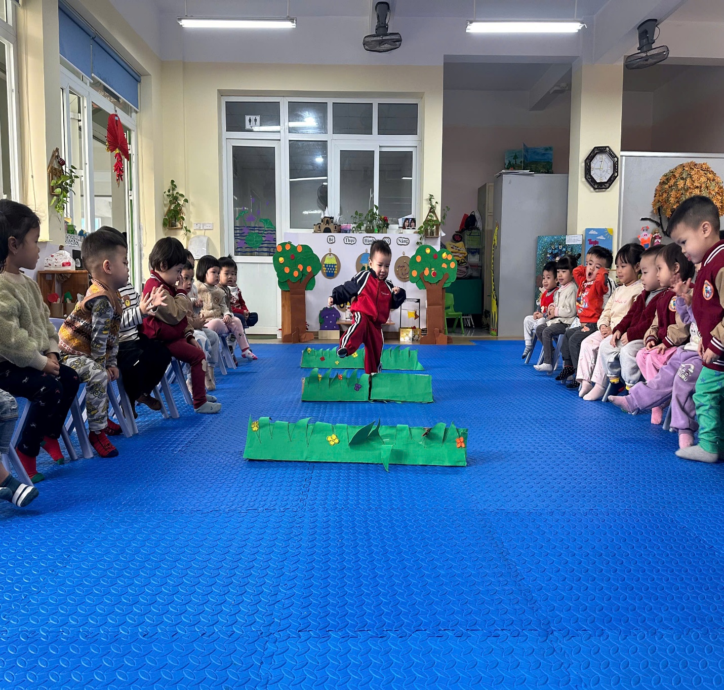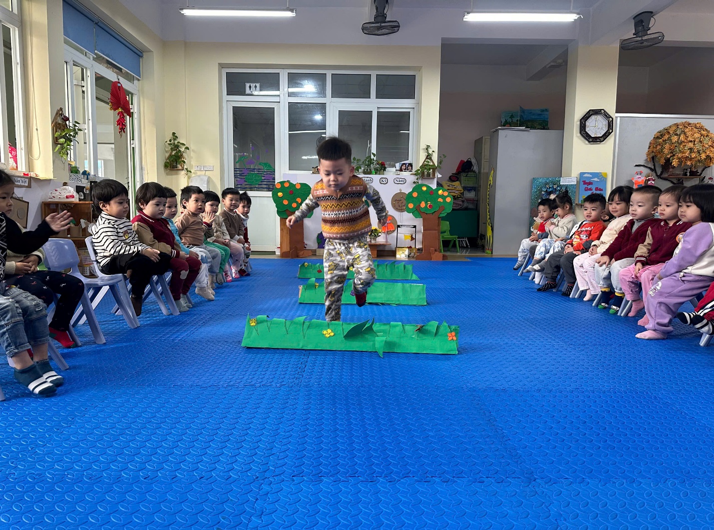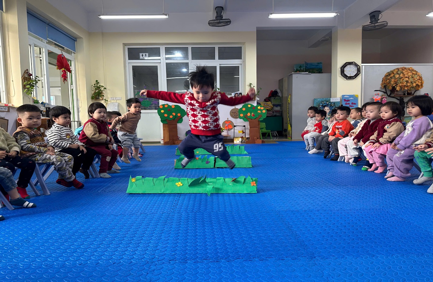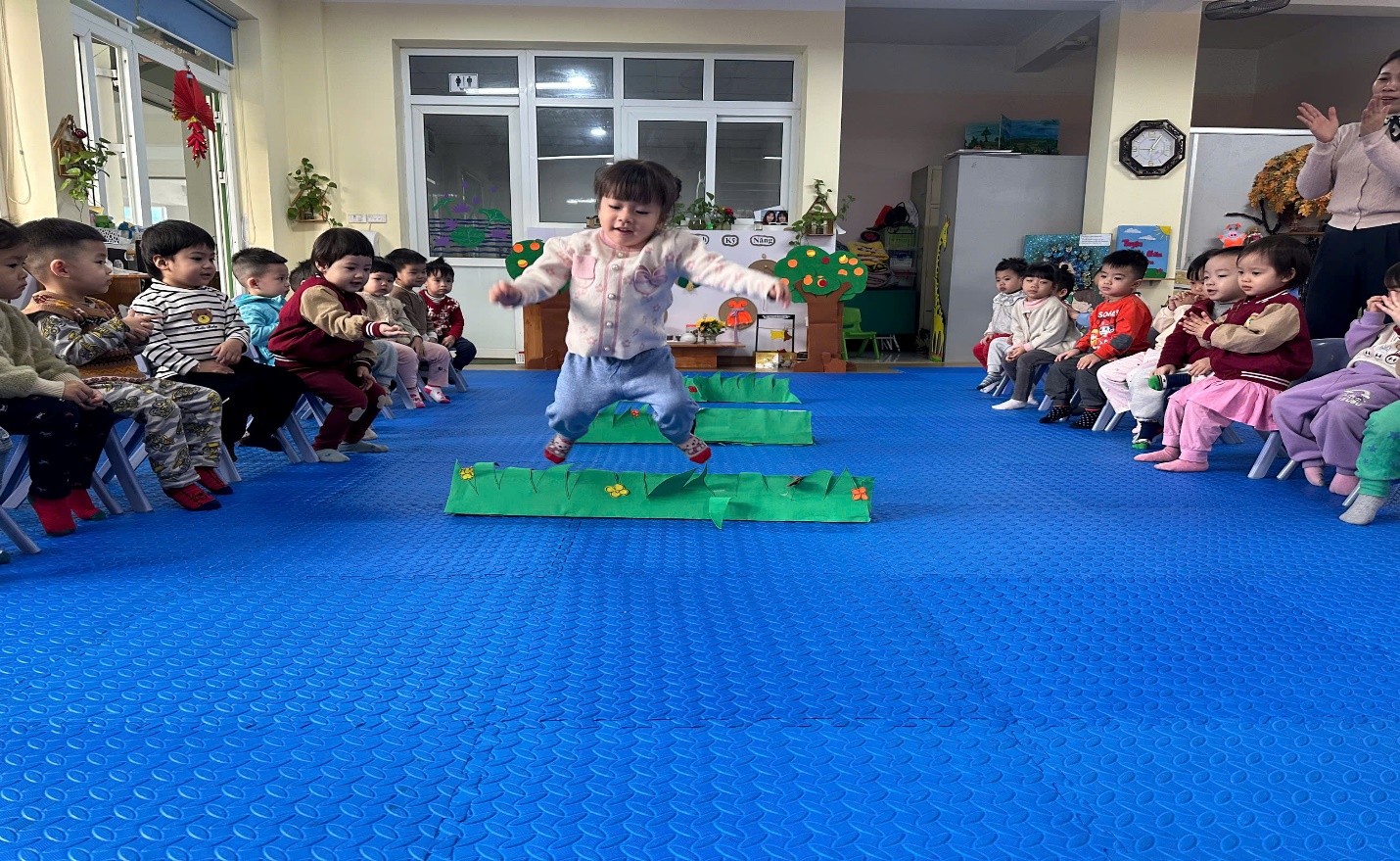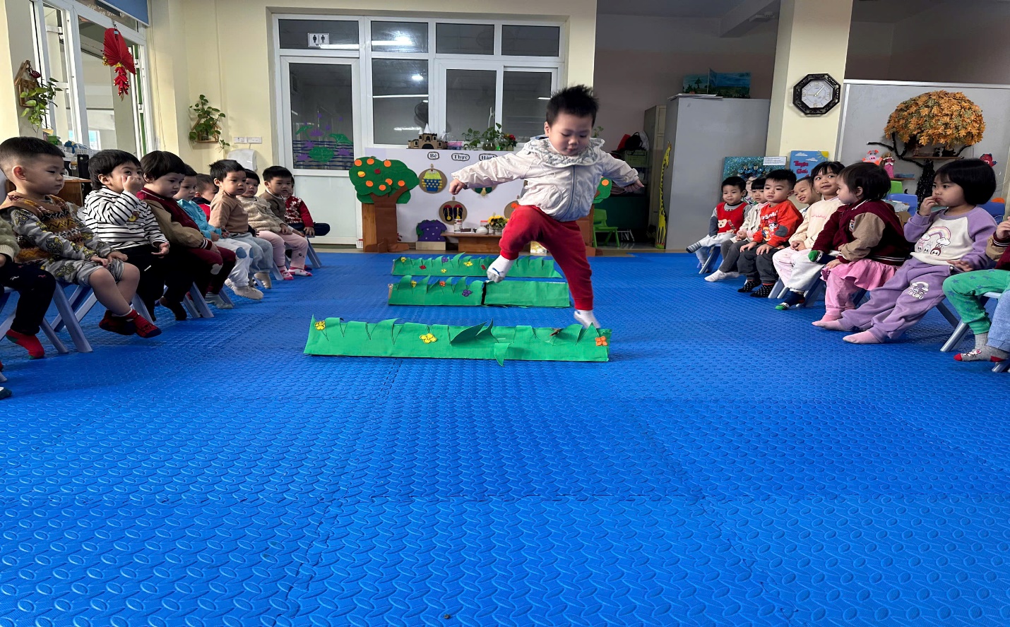 Sau đây là một số hình ảnh các bé nhà trẻ lớp D2 trong giờ hoạt động phát triển vận động: Bật qua vât cản