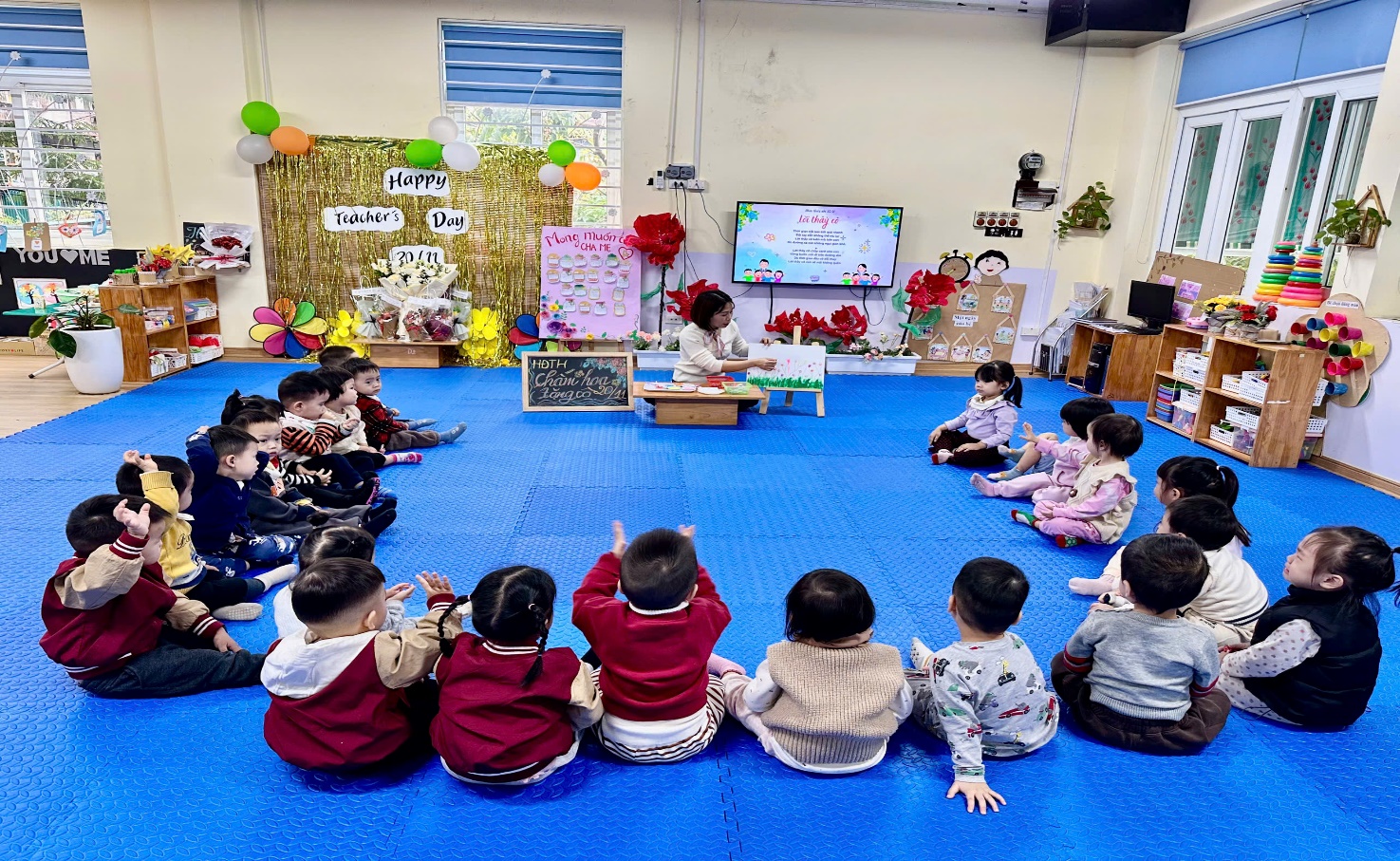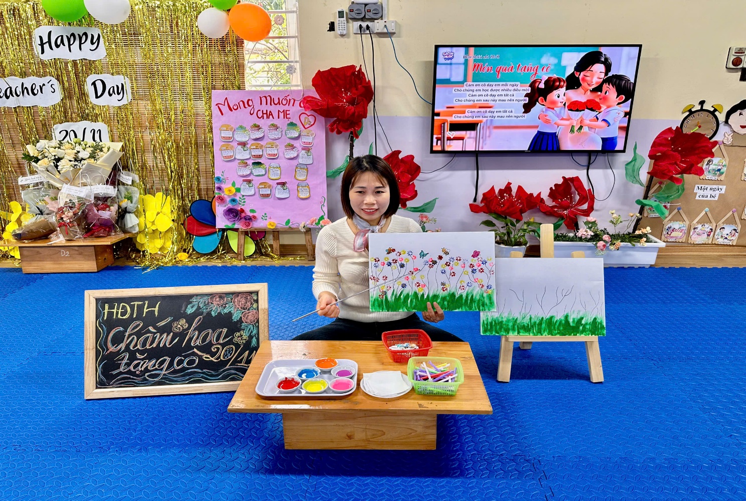 Hoạt động "Làm hoa tặng cô" ngày 20/11 là hoạt động tạo hình cho học sinh, bao gồm Chấm hoa,vẽ hoa, nặn hoa, hoặc làm hoa từ vật liệu như giấy, đất nặn, để tặng thầy cô giáo. Các hoạt động này giúp trẻ thể hiện lòng biết ơn, rèn luyện sự khéo léo của đôi bàn tay và khả năng sáng tạo, cũng như hiểu ý nghĩa của ngày Nhà giáo Việt Nam.