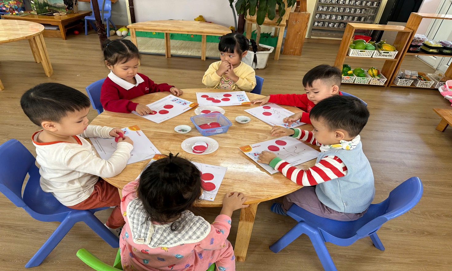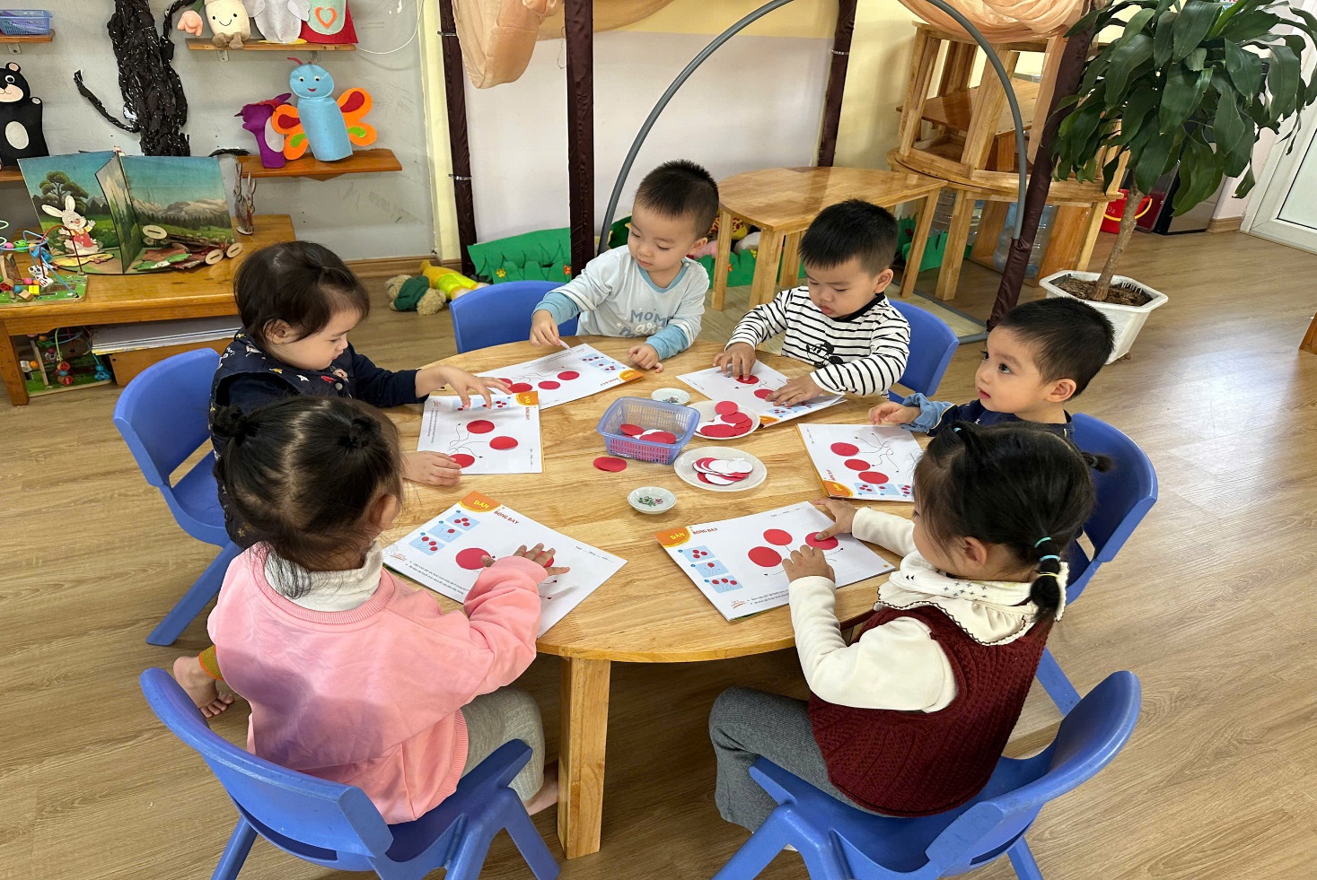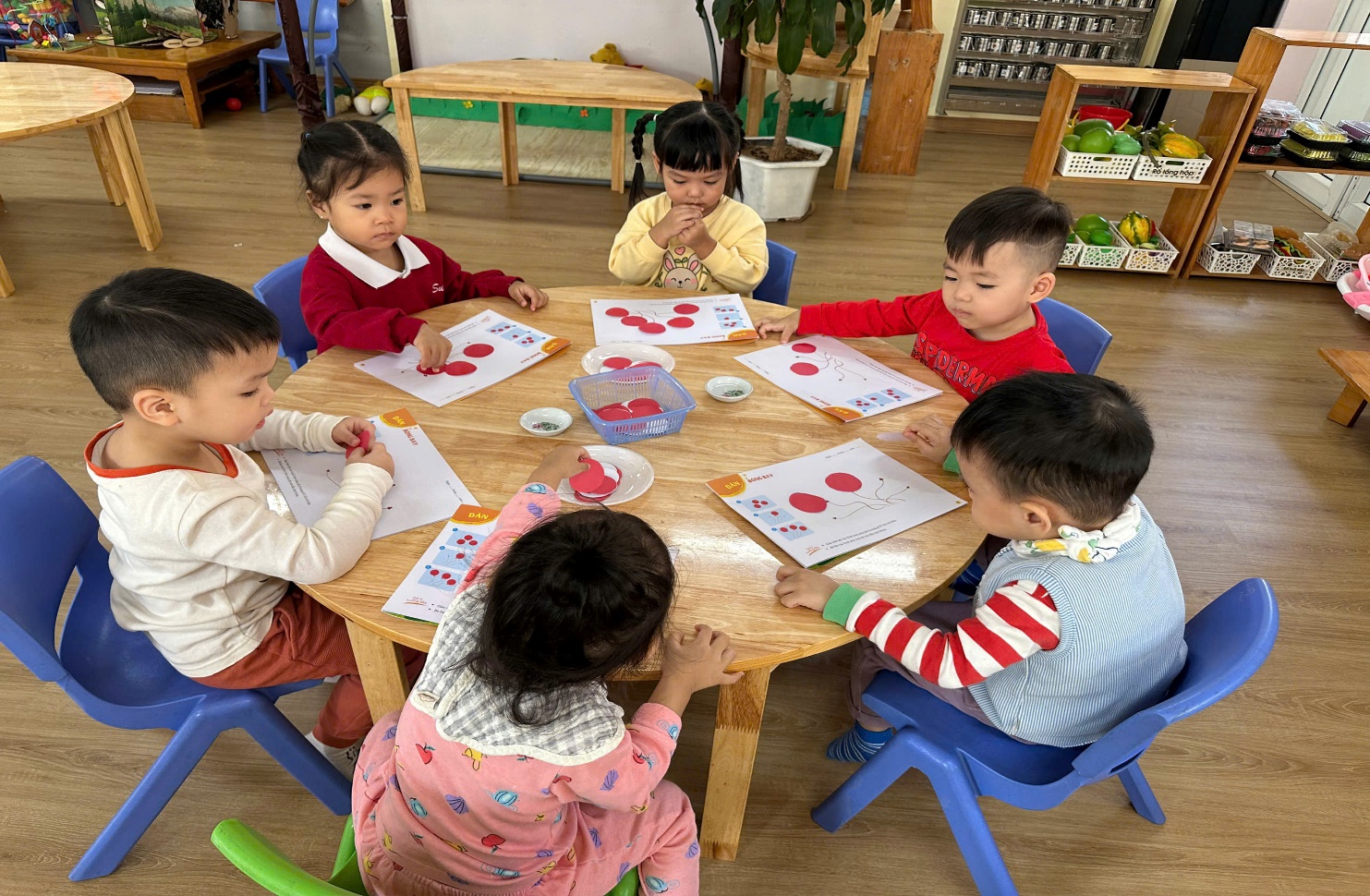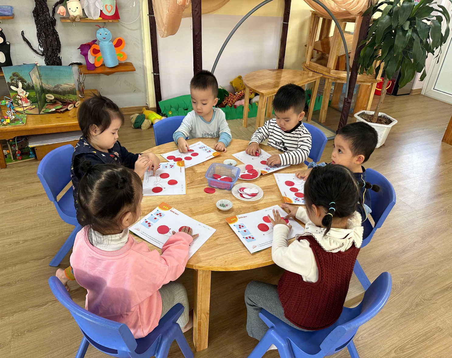 Sau đây là một số hình ảnh các bé nhà trẻ D2 trong giờ tạo hình; Dán chùm bóng màu đỏ