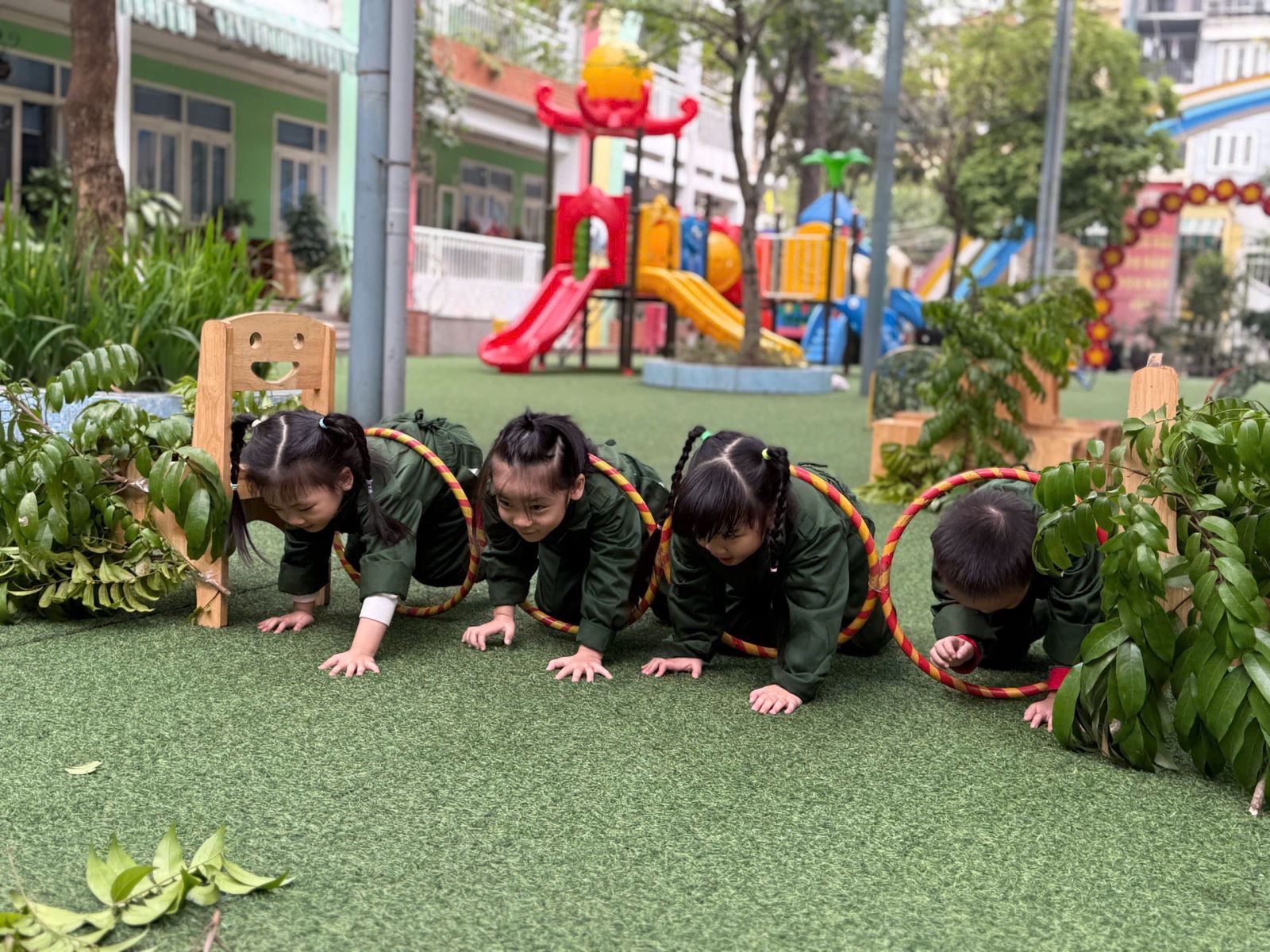 Trong ngày trải nghiệm, các bé được tham gia nhiều hoạt động vận động hấp dẫn mô phỏng cuộc sống và nhiệm vụ của người lính. Các con cùng nhau bò qua hầm ngụy trang, vượt chướng ngại vật, chui vòng, giữ thăng bằng, rèn luyện sự nhanh nhẹn, khéo léo và tinh thần dũng cảm. Mỗi thử thách đều được các bé tham gia với tinh thần hào hứng, đoàn kết và quyết tâm hoàn thành nhiệm vụ.