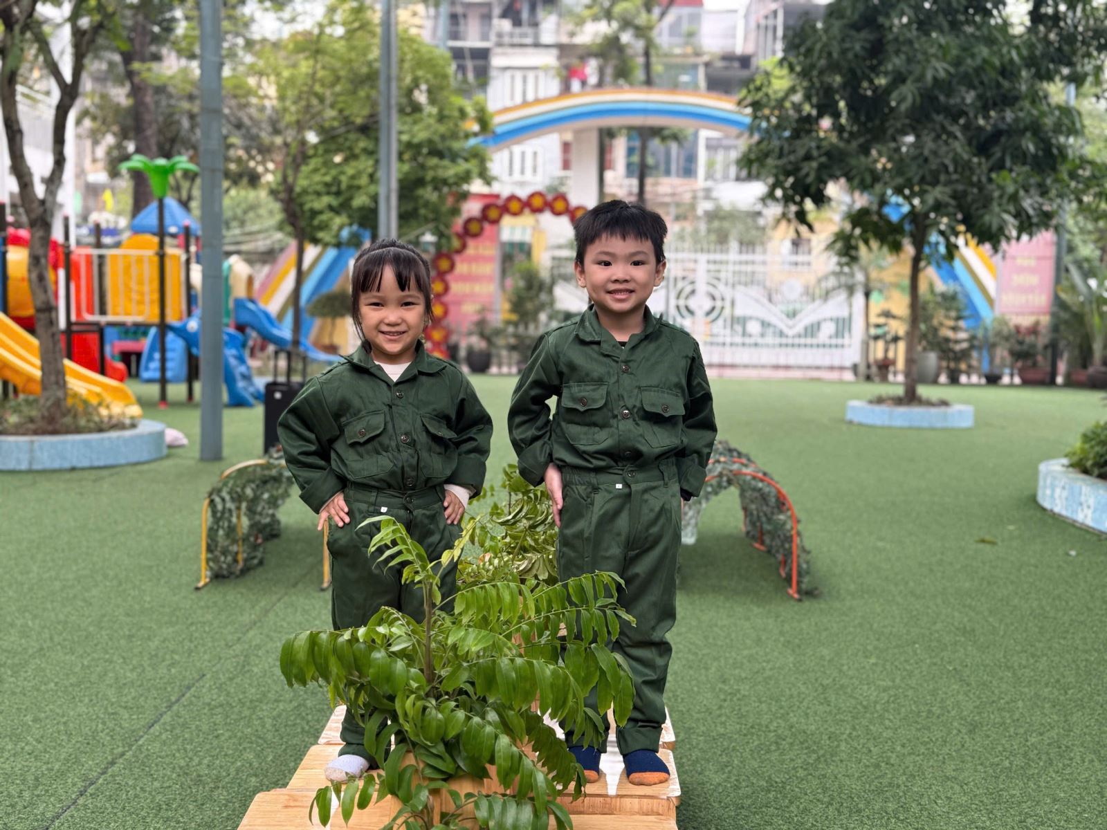 Ngay từ sáng sớm, các con đã háo hức khoác lên mình bộ trang phục màu xanh bộ đội. Trong bộ quân phục giản dị nhưng đầy tự hào, các bé trông thật đáng yêu và chững chạc như những “chiến sĩ nhí”. Nụ cười rạng rỡ trên khuôn mặt các con đã tạo nên một không gian vui tươi, tràn đầy năng lượng.