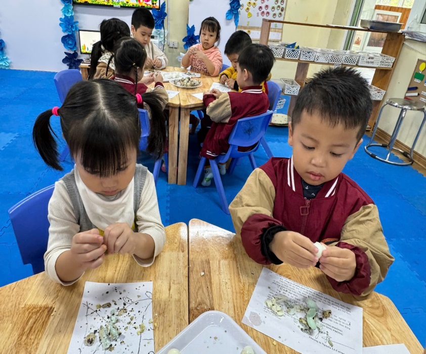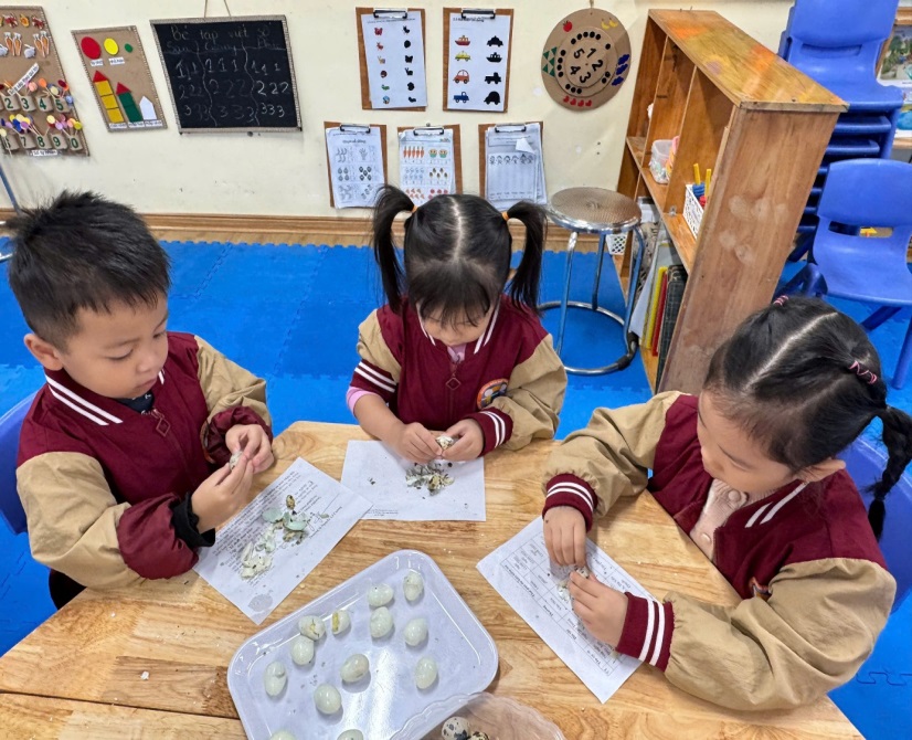 Sau đây là một số hình ảnh của các bé trong giờ hoạt động bé tập làm nội trợ với kỹ năng bóc vỏ trứng cúCả lớp chăm chỉ bóc trứng