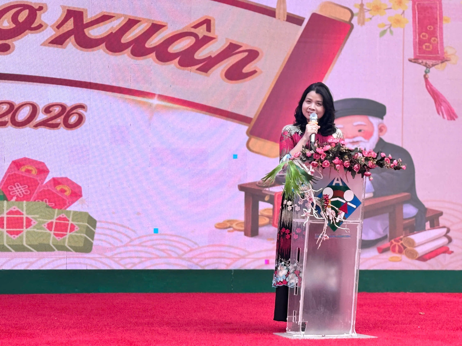 Cô Phùng Thị Bích Hiền – Bí thư Chi bộ - Hiệu trưởng nhà trường phát biểu khai mạc Hội chợ Xuân 2026