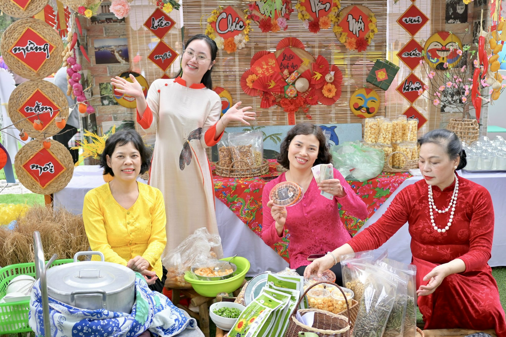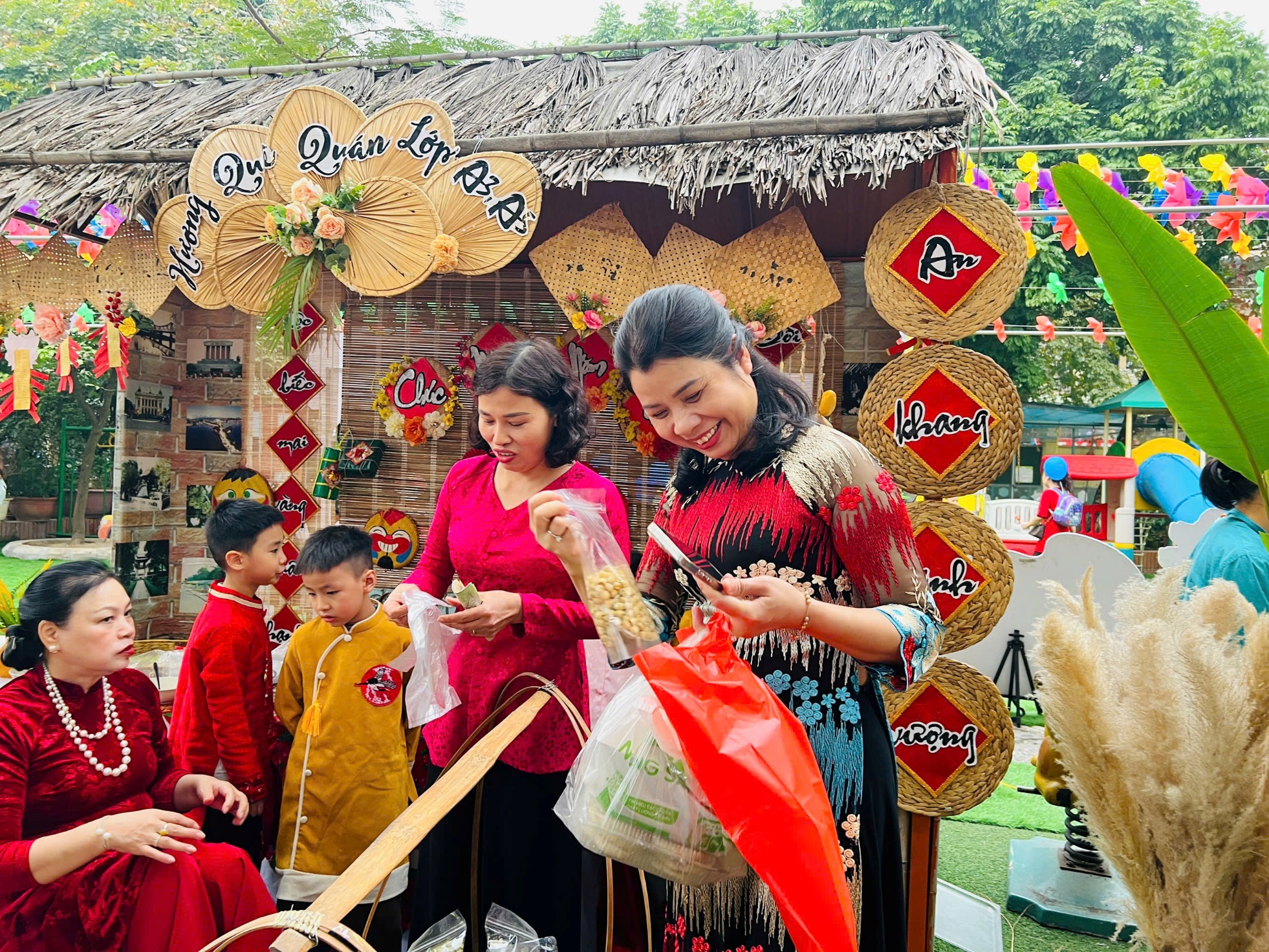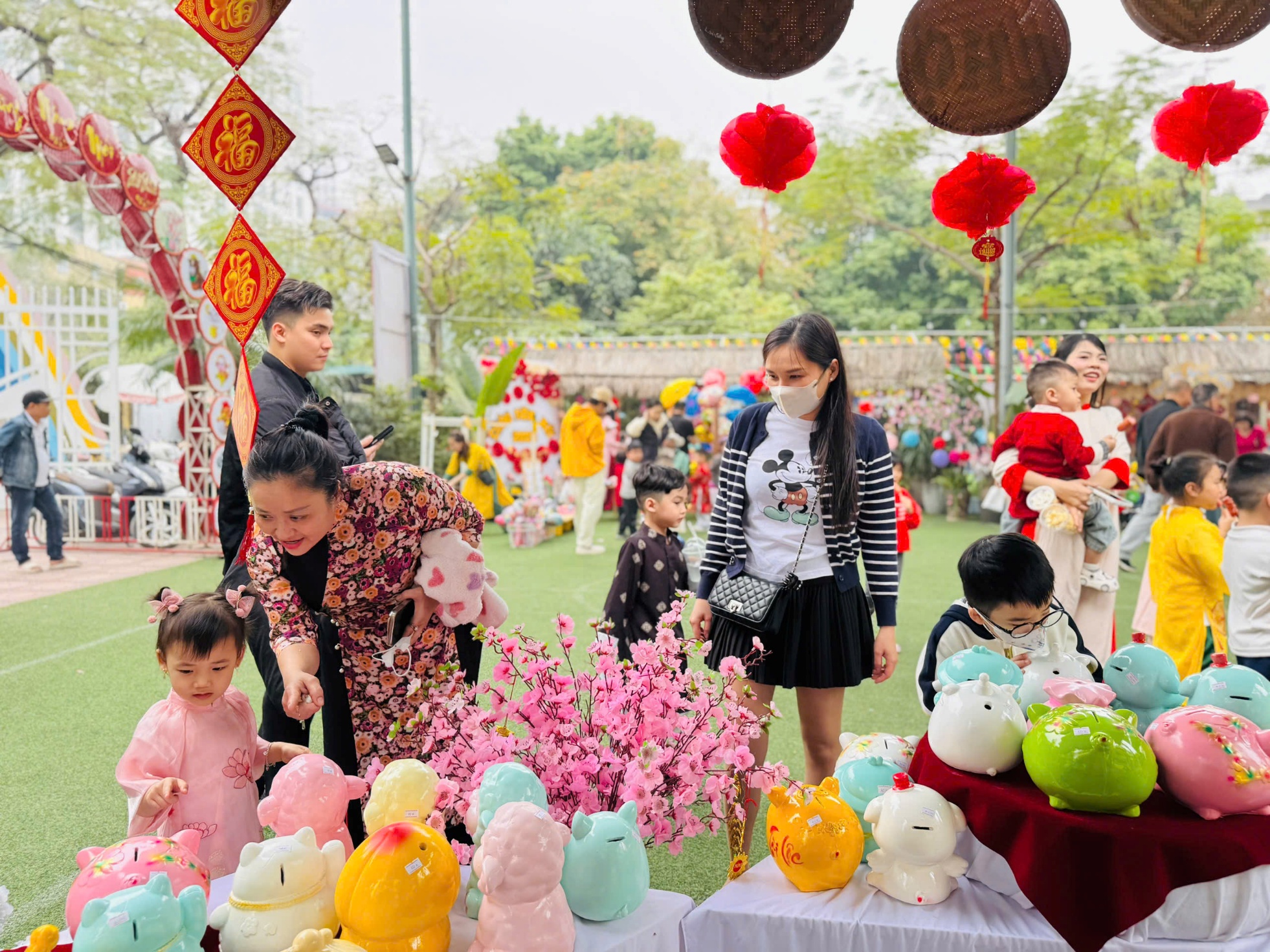 Không gian Hội chợ Xuân được trang trí rực rỡ, đậm đà hương vị Tết xưa với các gian hàng mang nét văn hóa truyền thống, những vật dụng quen thuộc của ngày Tết cổ truyền. Mỗi góc nhỏ đều được chăm chút tỉ mỉ, tạo nên một không gian gần gũi, thân thương, giúp các bé như được “chạm” vào Tết bằng tất cả các giác quan.
