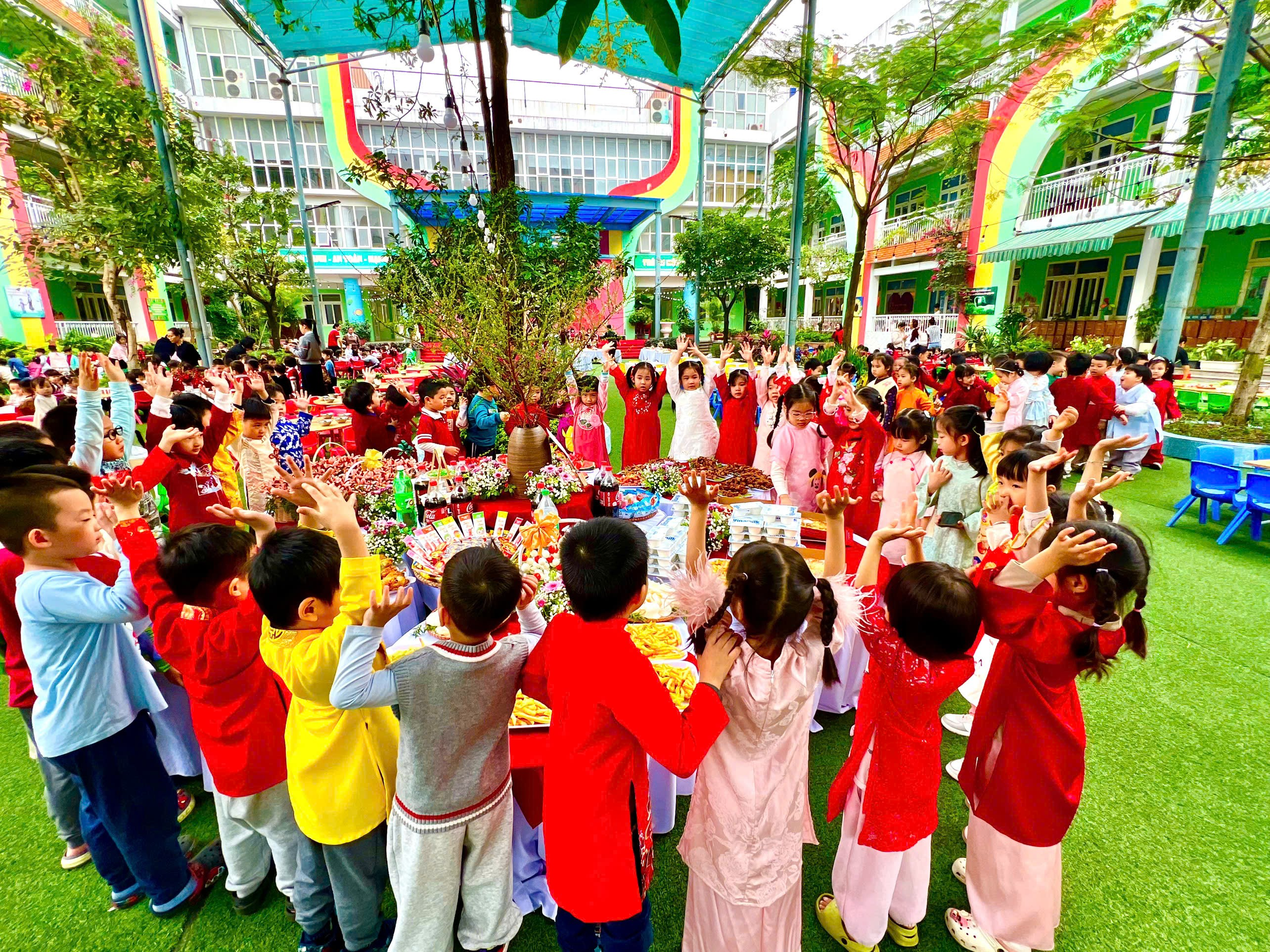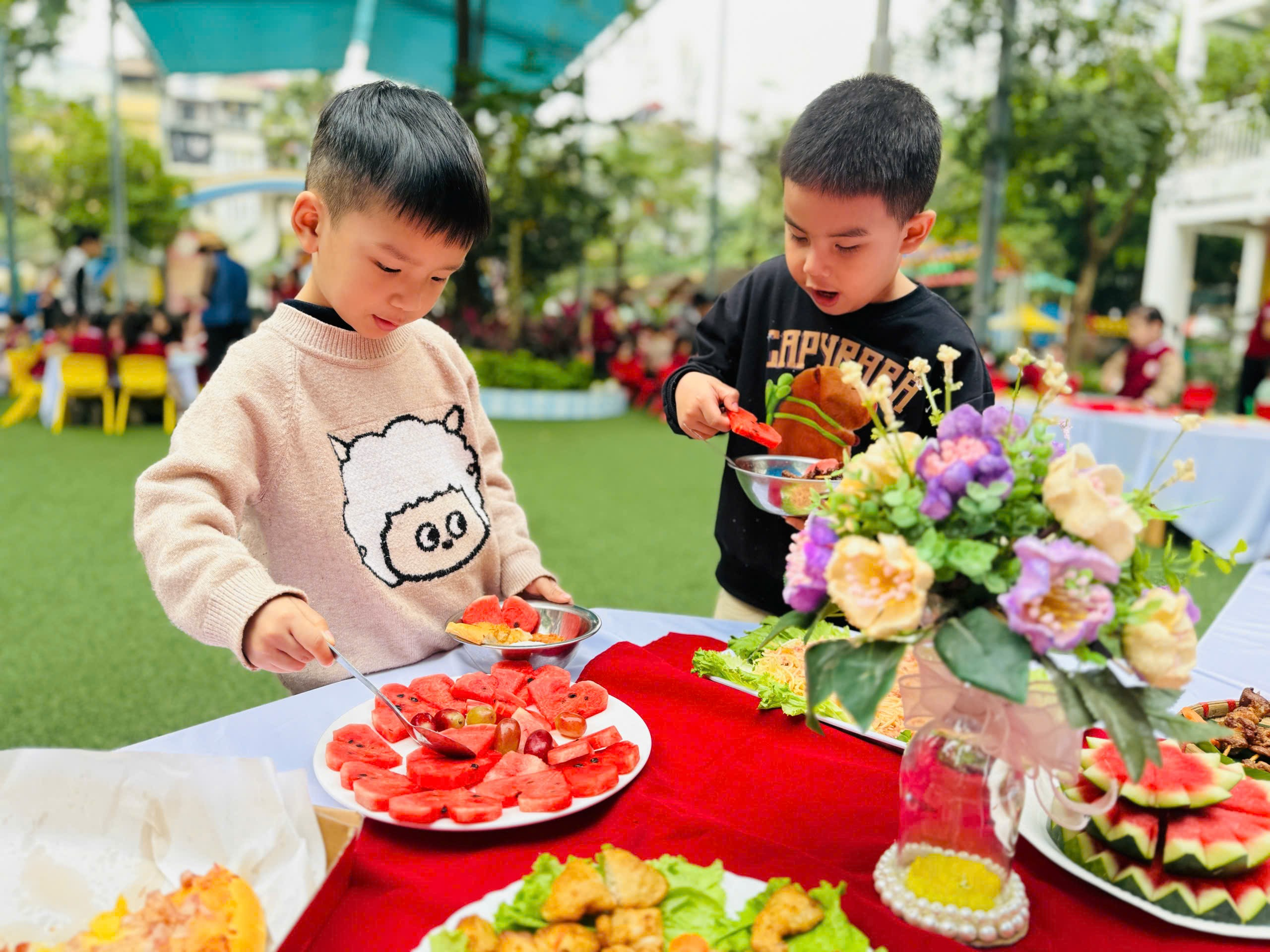 Bữa tiệc diễn ra trong không khí vui vẻ, ấm áp với những tiếng cười hồn nhiên và sự hào hứng của các con. Các bé được ngồi ăn cùng bạn bè dưới khuôn viên sân trường xanh – sạch – đẹp, cùng trò chuyện, chia sẻ món ăn và cảm nhận niềm vui khi tham gia hoạt động tập thể. Đây cũng là dịp để các con mạnh dạn hơn trong giao tiếp, tăng cường sự gắn bó với bạn bè trong và ngoài lớp.