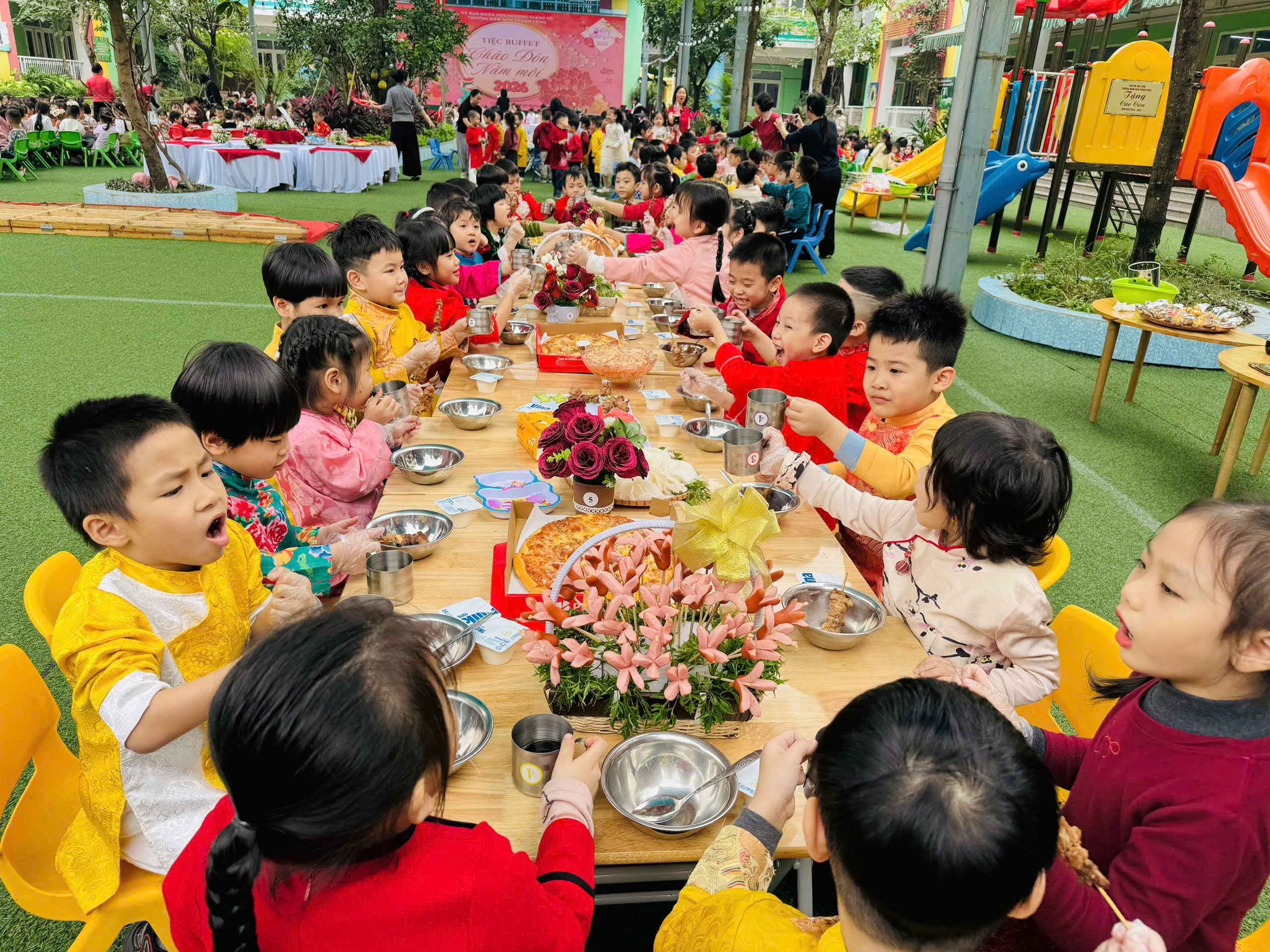 Bữa tiệc được tổ chức tại khu vực sân trường với sự chuẩn bị chu đáo, cẩn thận của các cô trong nhà trường. Thực đơn phong phú, đa dạng gồm các món ăn quen thuộc, phù hợp với lứa tuổi mầm non, đảm bảo đầy đủ dinh dưỡng và an toàn vệ sinh thực phẩm. Các món ăn được bày trí khoa học, gọn gàng, đẹp mắt, tạo sự hấp dẫn và kích thích hứng thú ăn uống của trẻ.