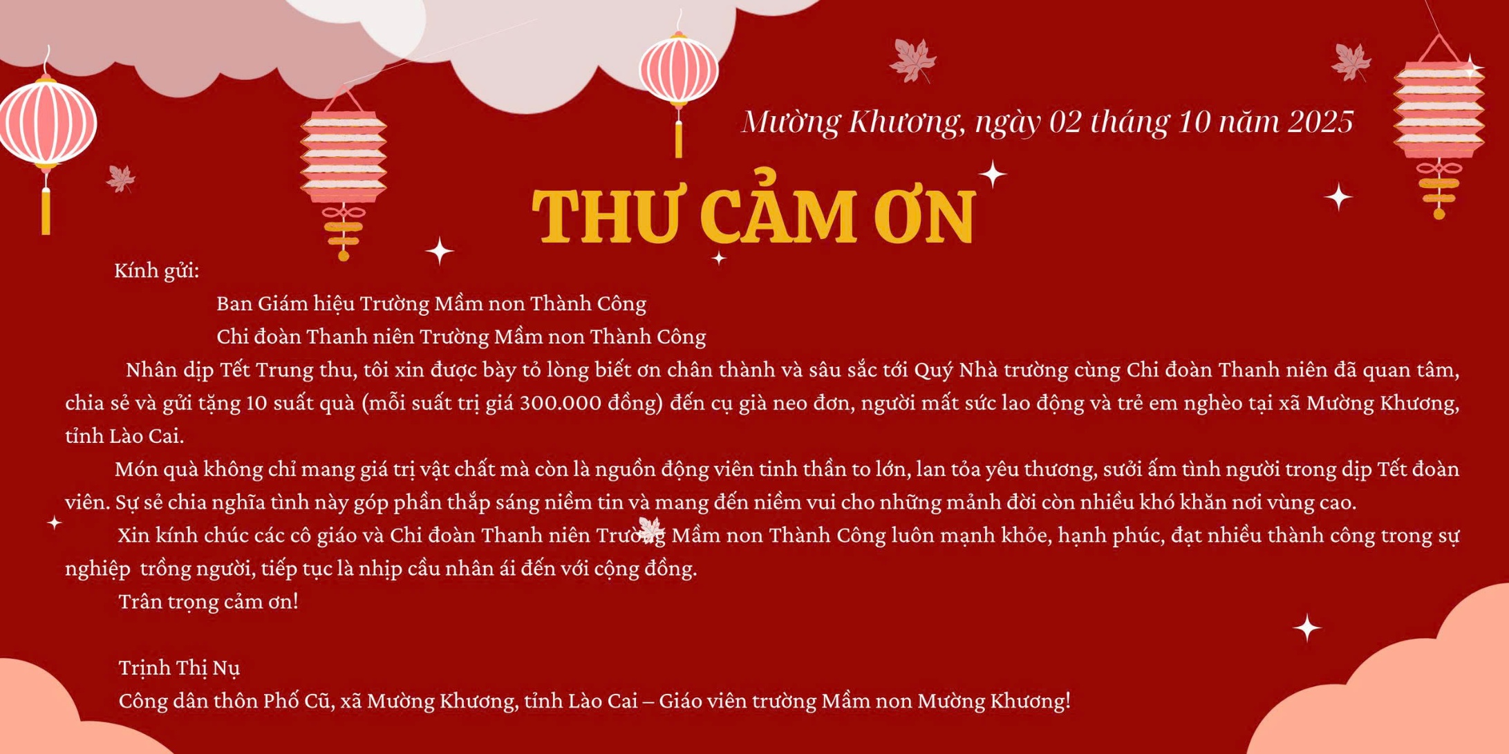 Từ vùng cao Mường Khương xa xôi, cô giáo Trịnh Thị Nụ cũng đã gửi lời cảm ơn chân thành đến tập thể Trường Mầm non Thành Công. Cô cho biết, với sự hỗ trợ của nhà trường, 10 suất quà (mỗi suất trị giá 300.000 đồng) đã được gửi tặng đến cụ già neo đơn, người mất sức lao động và trẻ em nghèo tại địa phương.