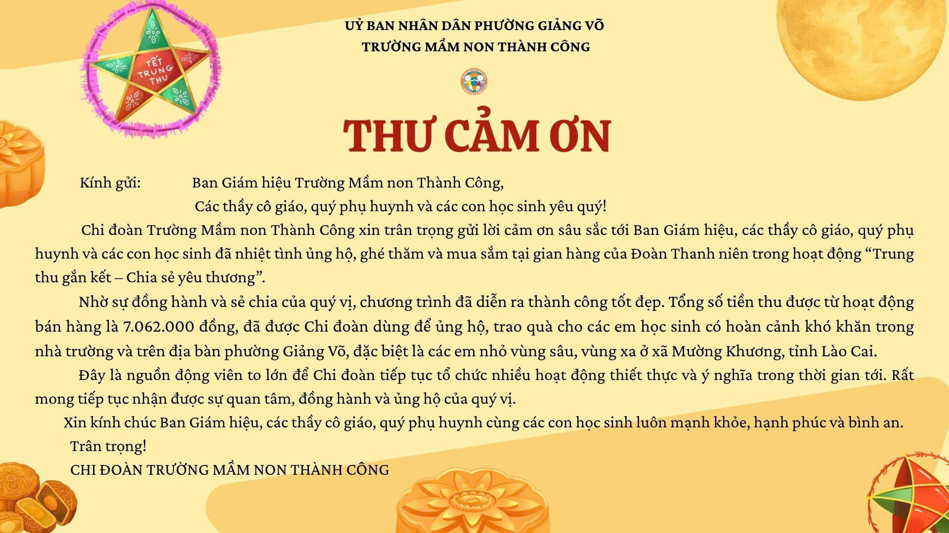 Sau chương trình, Nhà trường và Đoàn thanh niên Trường Mầm non Thành Công gửi lời cảm ơn ân sâu sắc, các cô giáo, phụ huynh và học sinh đã đồng hành, góp phần tạo nên thành công của chương trình “Trung thu gắn kết – Chia sẻ yêu thương”. Toàn bộ số tiền 7.062.000 đồng đã được sử dụng đúng mục đích, trao tặng tới các em nhỏ và gia đình có hoàn cảnh khó khăn.