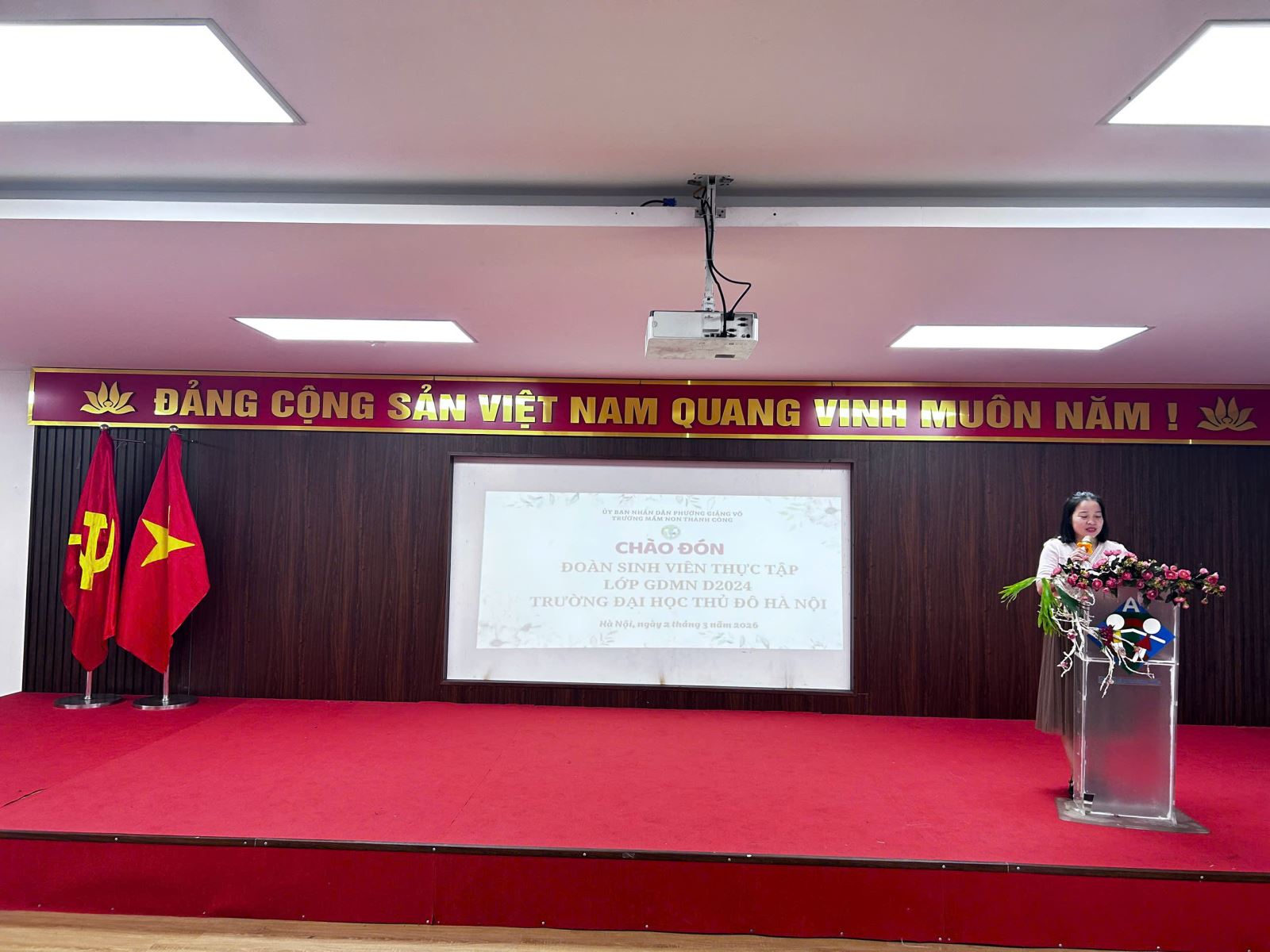 Đại diện Ban Giám hiệu, cô giáo Nguyễn Ngọc Huyền - Phó Hiệu trưởng nhà trường triển khai các hoạt động chuyên môn đáp ứng với nhu cầu thực tập của các em sinh viên, và bày tỏ mong muốn các em sẽ tích lũy được nhiều kinh nghiệm, rèn luyện kỹ năng và đạt kết quả tốt trong đợt thực tập này.