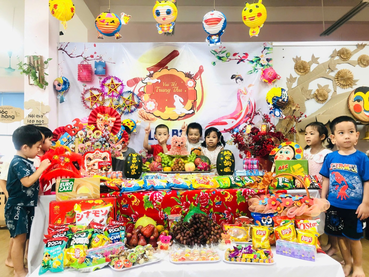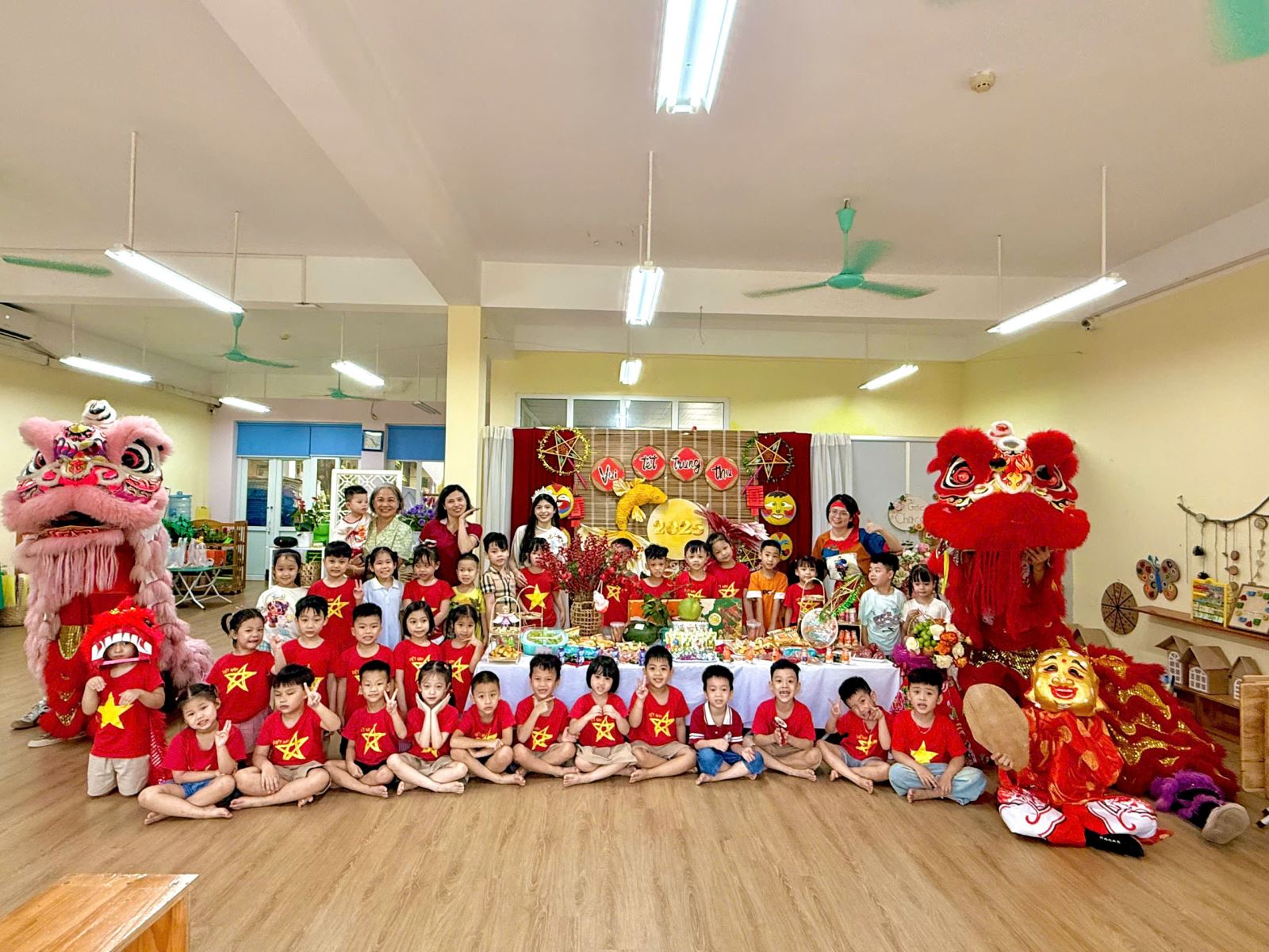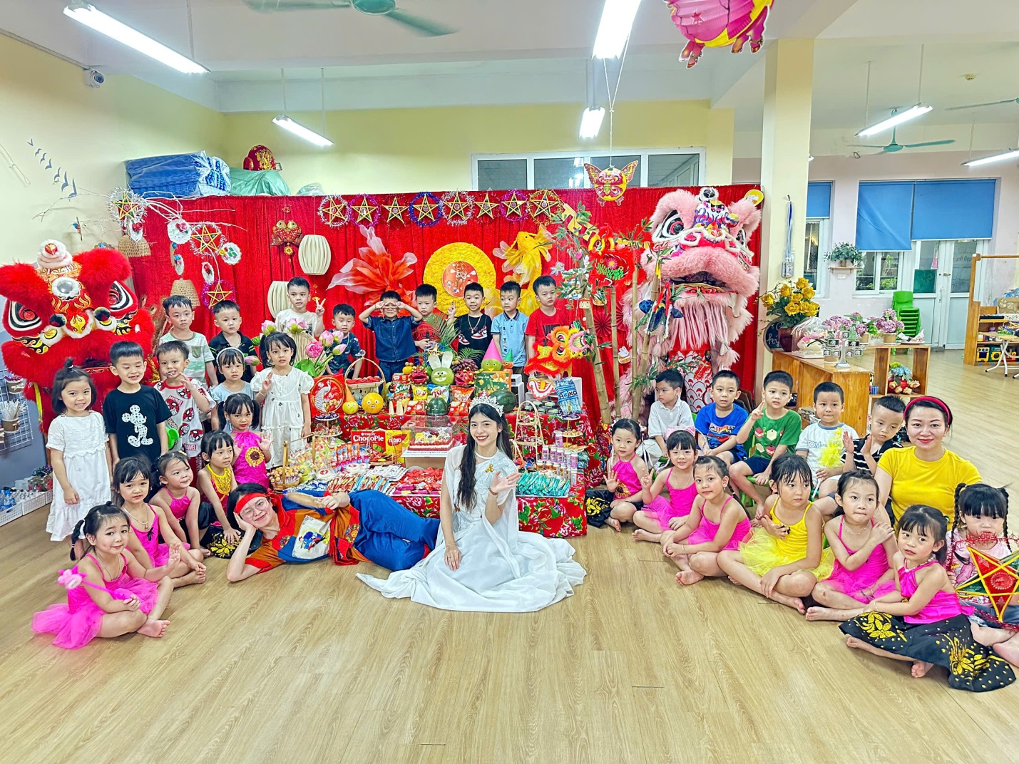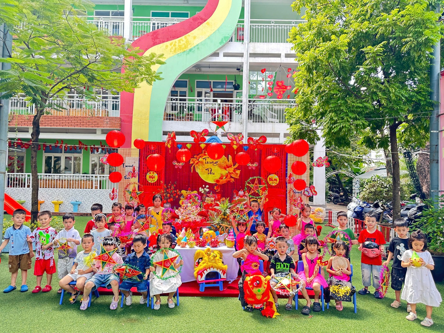 Ngay từ cổng trường, các bé đã vô cùng thích thú khi được chào đón trong không gian trang trí đầy sắc màu: đèn lồng, mâm cỗ trung thu, và hình ảnh quen thuộc của chú Cuội – chị Hằng. Khuôn viên sân trường được biến hóa thành một sân khấu rực rỡ, mang đậm nét truyền thống dân gian.