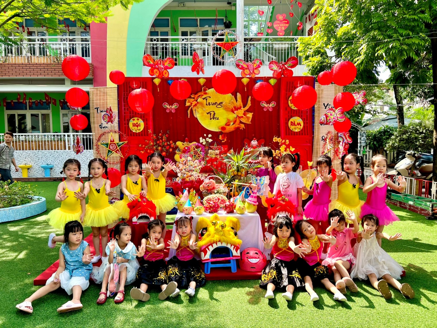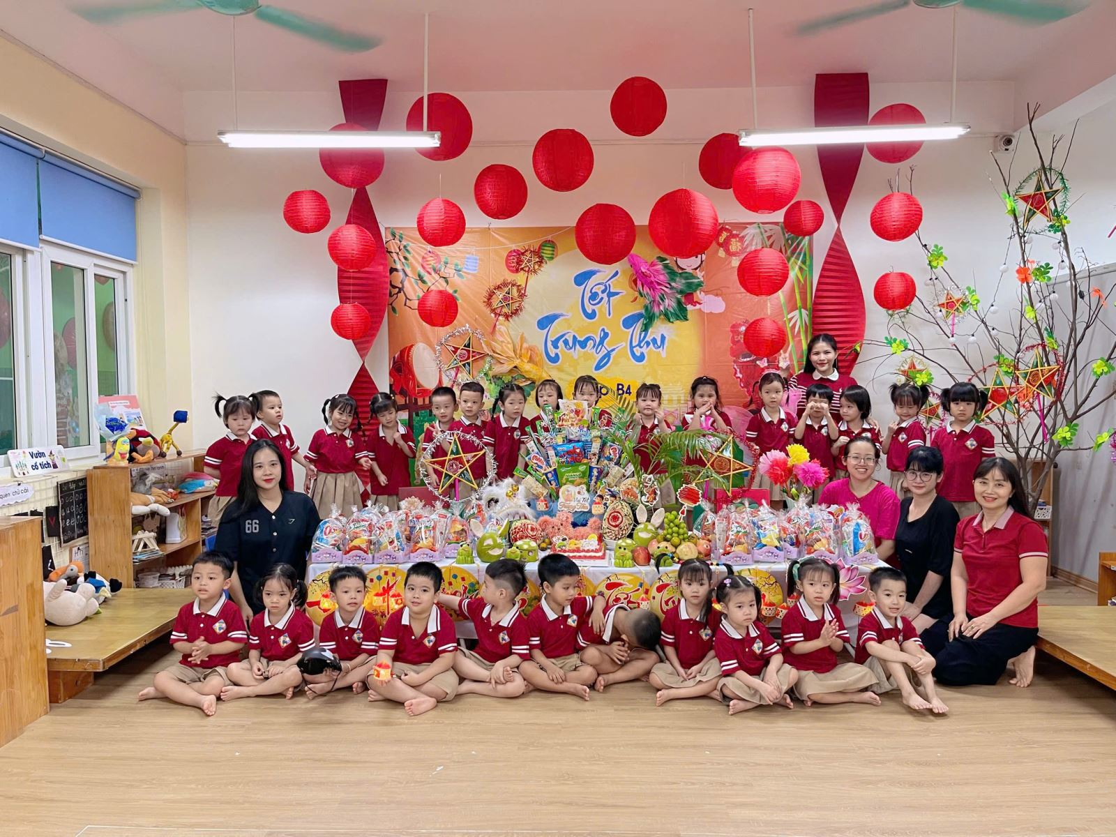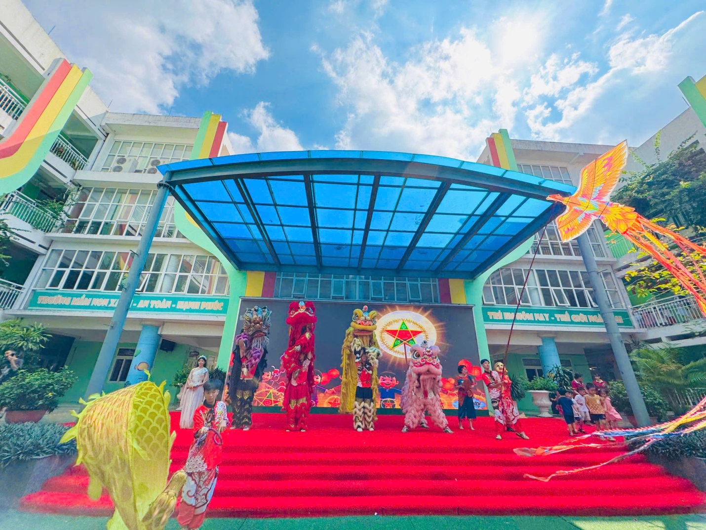 Ngay từ cổng trường, các bé đã vô cùng thích thú khi được chào đón trong không gian trang trí đầy sắc màu: đèn lồng, mâm cỗ trung thu, và hình ảnh quen thuộc của chú Cuội – chị Hằng. Khuôn viên sân trường được biến hóa thành một sân khấu rực rỡ, mang đậm nét truyền thống dân gian.