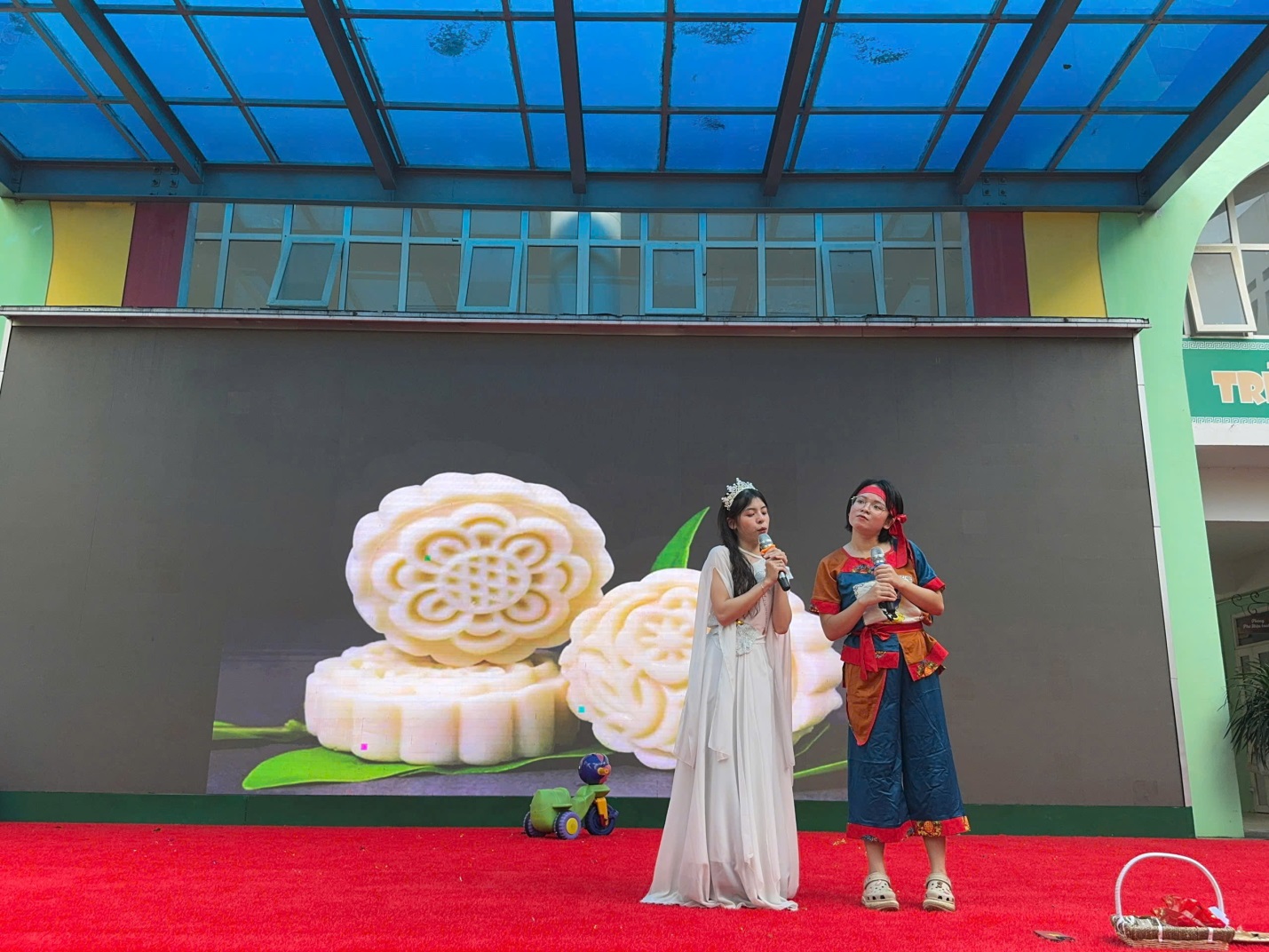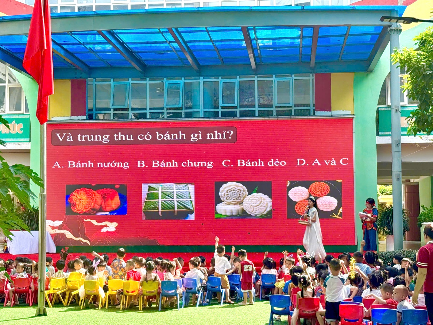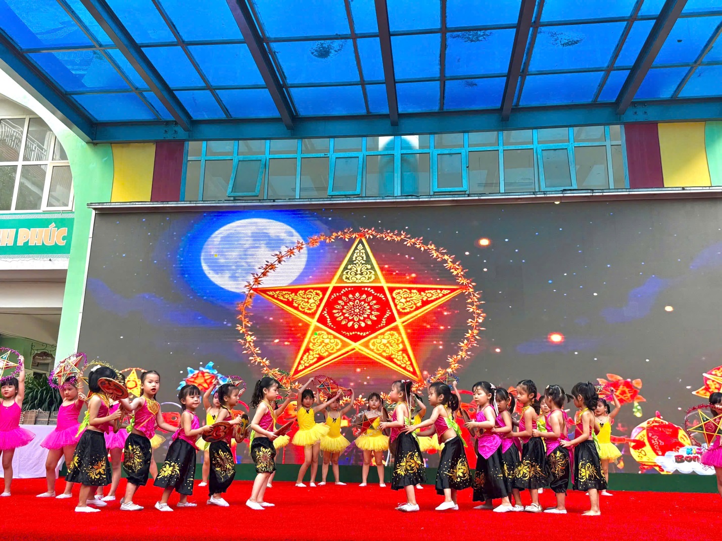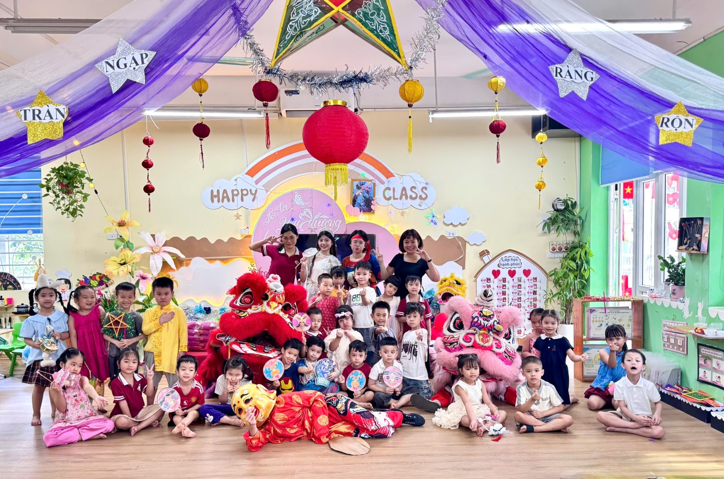 Ngay từ cổng trường, các bé đã vô cùng thích thú khi được chào đón trong không gian trang trí đầy sắc màu: đèn lồng, mâm cỗ trung thu, và hình ảnh quen thuộc của chú Cuội – chị Hằng. Khuôn viên sân trường được biến hóa thành một sân khấu rực rỡ, mang đậm nét truyền thống dân gian.