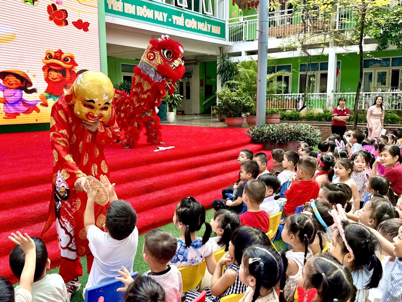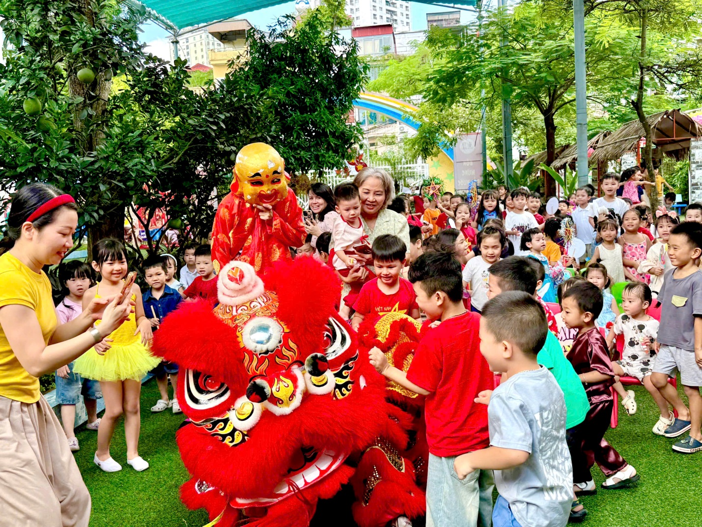 Kết thúc chương trình là tiết mục múa lân truyền thống vô cùng đặc sắc. Đội múa lân biểu diễn những màn nhào lộn điêu luyện và nhảy múa sôi động trong tiếng trống rộn ràng, mang đến niềm vui và sự háo hức tột độ cho các bé. Nhiều em nhỏ không giấu được sự phấn khích, chạy theo chú lân để được chạm tay vào “linh vật may mắn”.