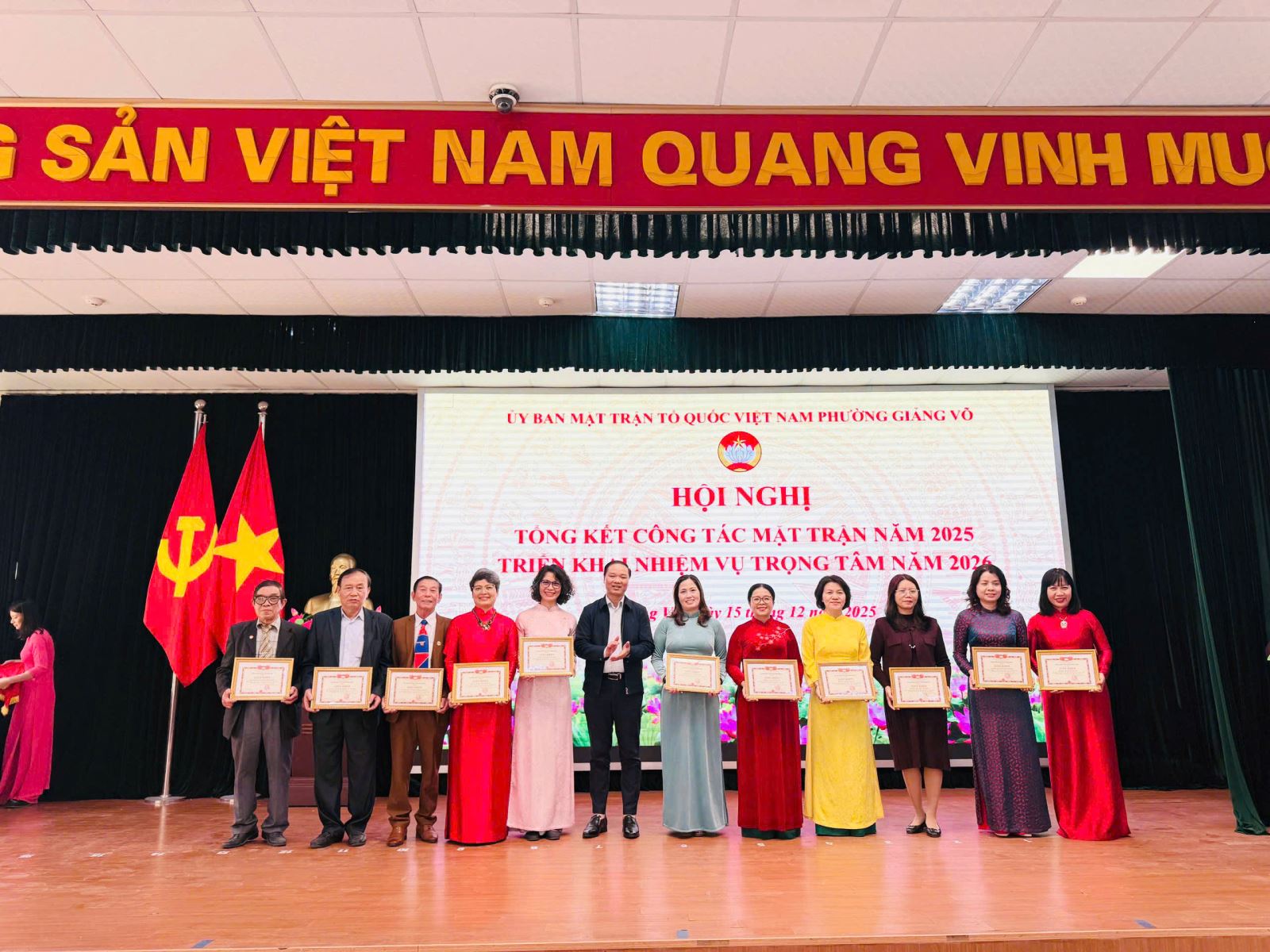 Cô giáo Phùng Thị Bích Hiền - Bí thư Chi bộ, hiệu trưởng trường Mầm non Thành Công ( đứng thứ 2 từ bên phải sang) đại diện nhà trường vinh dự nhận Giấy khen tại Hội nghị Tổng kết công tác Mặt trận năm 2025 do Ủy ban Mặt trận Tổ quốc Việt Nam phường Giảng Võ tổ chức