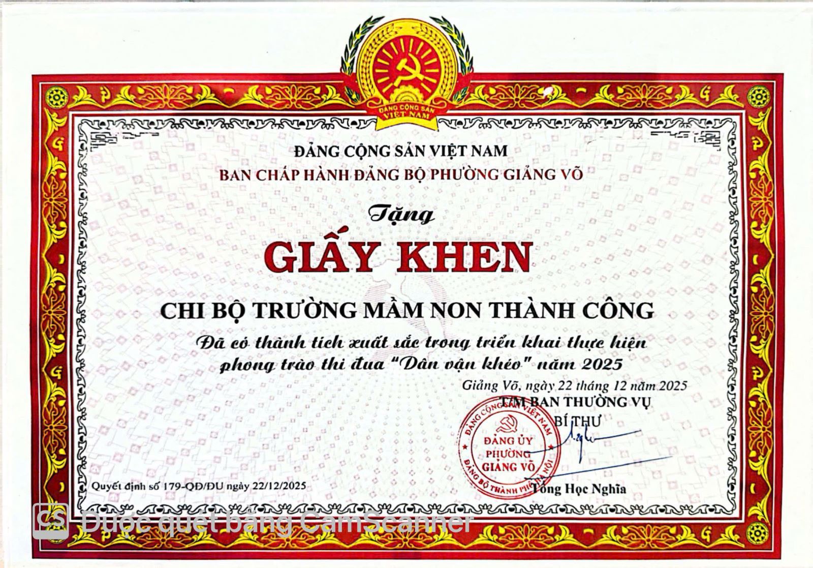 Dưới sự lãnh đạo của Chi bộ, trong năm 2025, phong trào “Dân vận khéo” tại Trường Mầm non Thành Công được triển khai linh hoạt, sáng tạo và hiệu quả. Nhà trường chú trọng xây dựng môi trường giáo dục thân thiện, tăng cường phối hợp với phụ huynh, lan tỏa những giá trị nhân văn trong từng hoạt động chăm sóc – giáo dục trẻ, qua đó tạo dựng niềm tin và sự đồng thuận của cộng đồng. Đây là sự ghi nhận đầy ý nghĩa đối với những nỗ lực bền bỉ của tập thể cán bộ, đảng viên nhà trường trong suốt một năm qua; thể hiện sự quan tâm, đánh giá cao của cấp ủy địa phương đối với những đóng góp của Chi bộ nhà trường trong công tác xây dựng Đảng và thực hiện nhiệm vụ giáo dục.