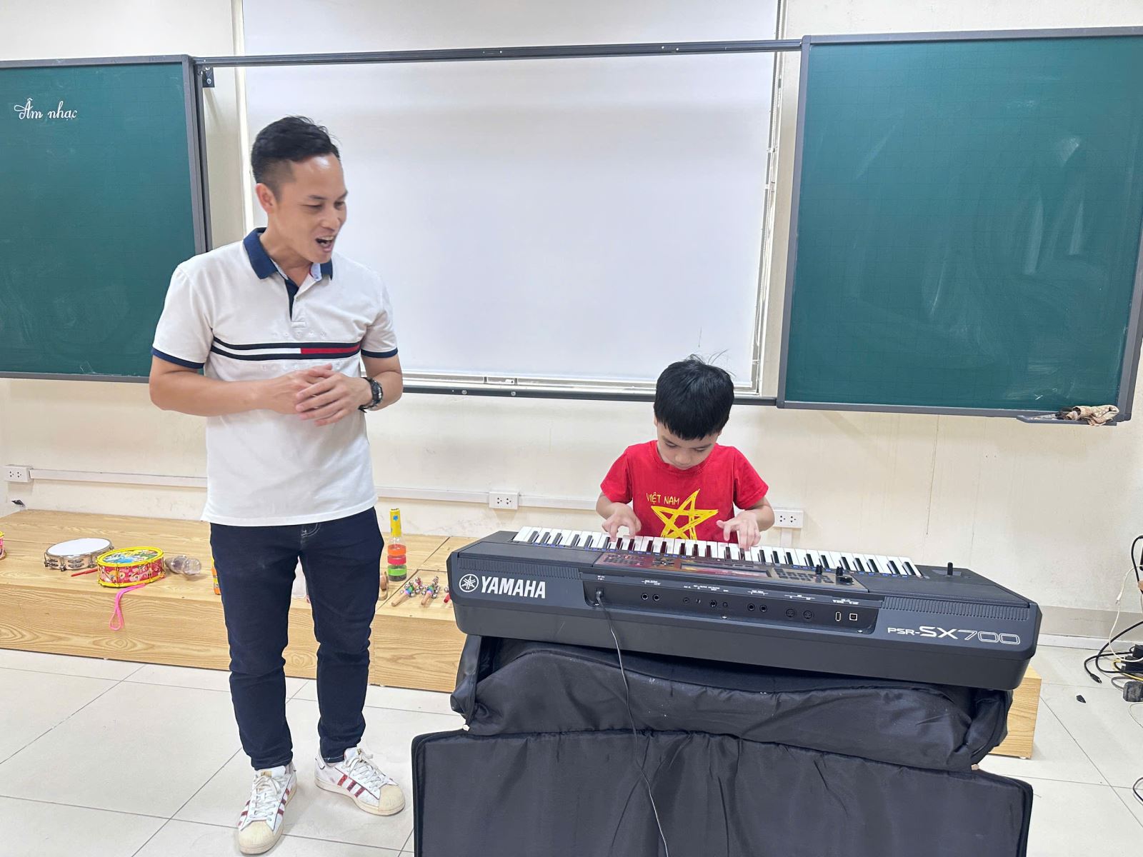 Hình ảnh bé được trải nghiệm đánh đàn Organ cùng thầy dạy Âm nhạc