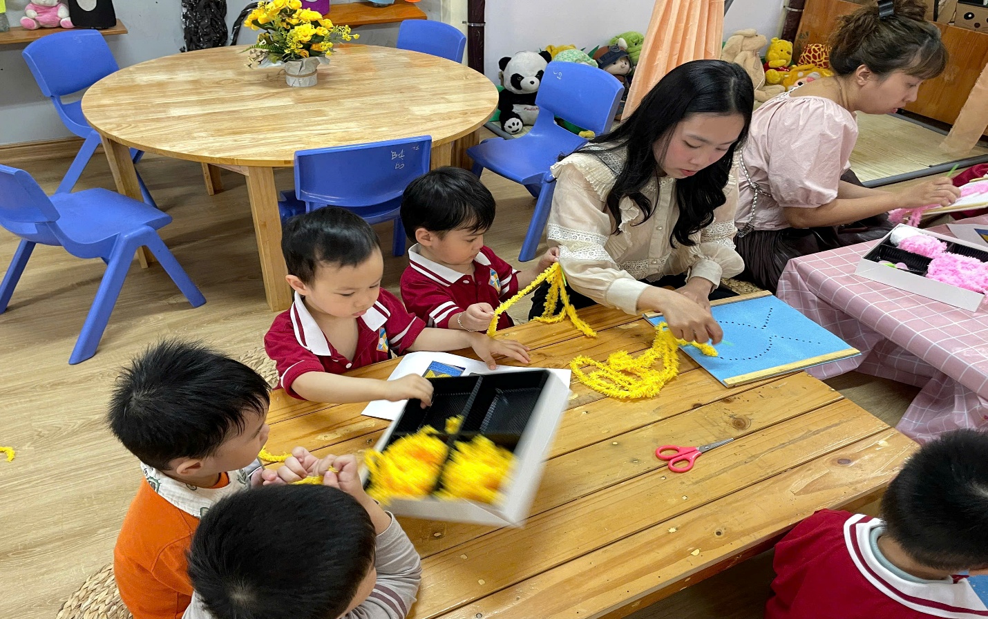 Các bé lớp nhà trẻ D2 đã có một tiết học thật thú vị và đầy cảm hứng cùng các cô khi được khám phá nghệ thuật thêu tranh bằng len xù – một hoạt động vừa khéo léo, vừa kích thích khả năng sáng tạo.